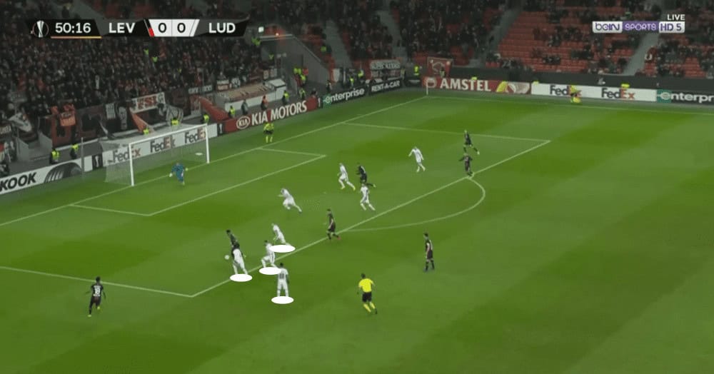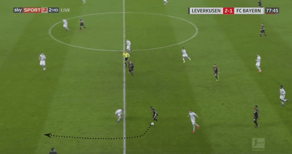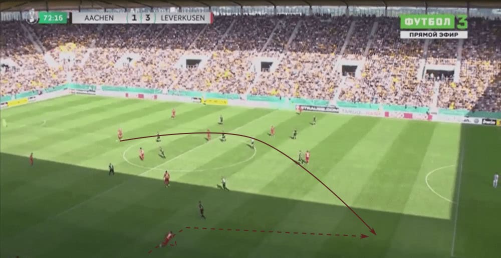 In the second situation, he has got two teammates in the centre but plays a long low cross to Karim Bellarabi since he hasn’t got any opponent who is marking him.