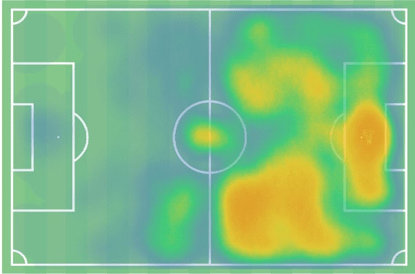 This is reflected in the heat map showing his actions from all competitions this season. Whilst there is plenty of action within the penalty box, as you would expect, it is interesting to see the amount of action in either half-space, specifically on the right side of the pitch. On top of this, there is a relatively large amount of actions occurring from within his own half as well.