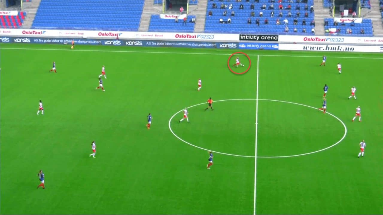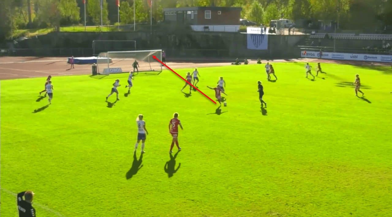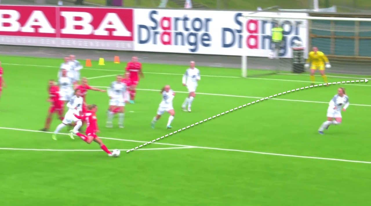 The following example shows another goal that Naalsund makes look easy, even though we all know that such goals are never easy to score. Naalsund was acting like an advanced playmaker in this action and was passing the ball around until she got the ball back near the edge of the box and saw an interval that allowed her to aim for shooting.