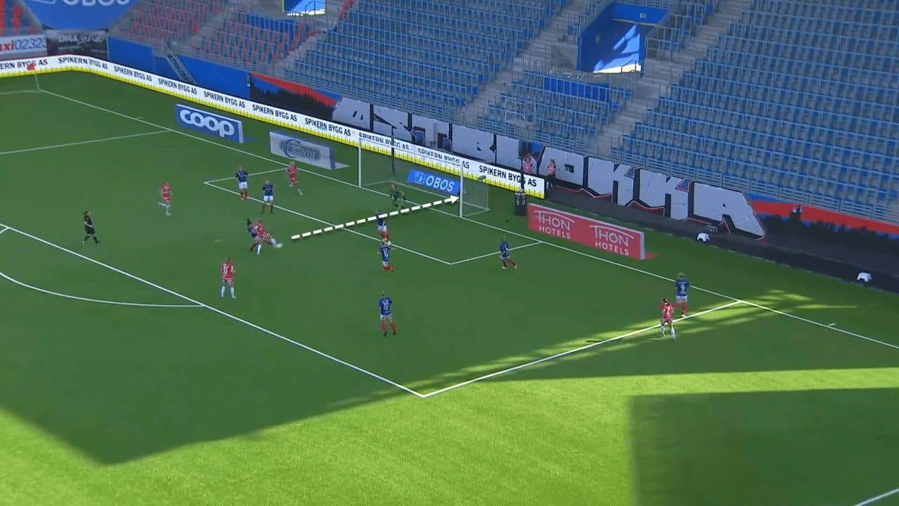 Naalsund can score half-volleys, too and deals with bouncing passes effectively as she becomes even more dangerous whenever she joins the box. This example highlights this ability to shoot while running and when receiving a ball that is difficult to control. Naalsund succeeds in shooting it with power and precision despite being tightly marked and disturbed, too.