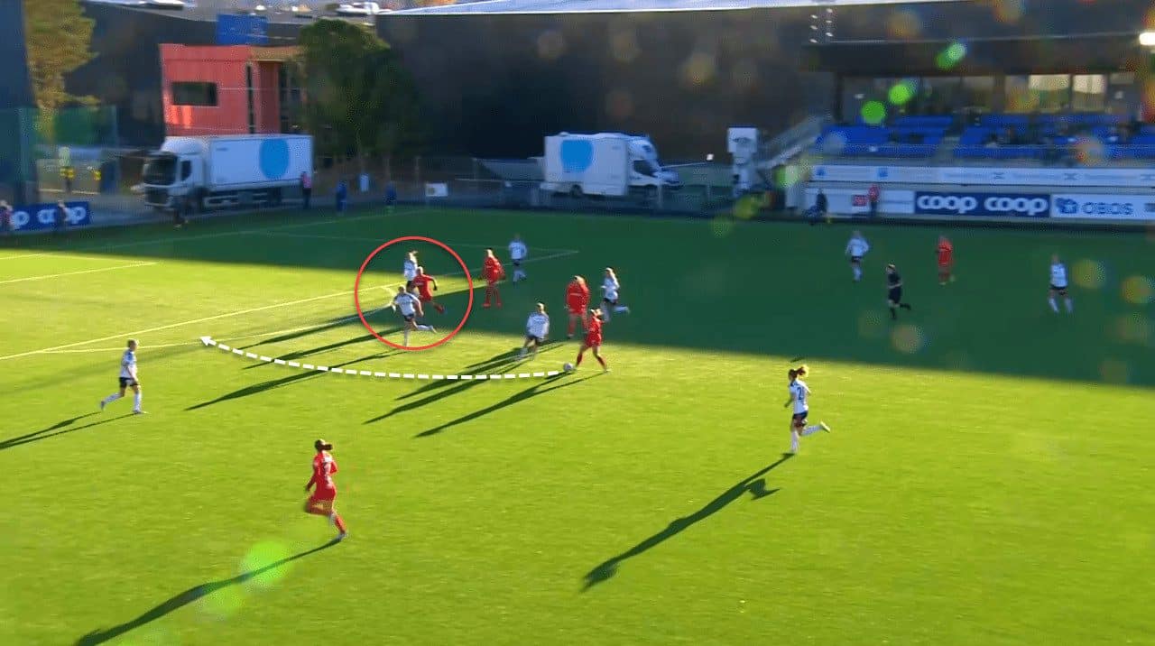 This picture highlights Naaalsund’s vision and varied passing techniques in general. She provided an assist for a teammate that two opponents surrounded, yet Naalsund’s pass with the exterior part of the foot helped her teammate meet the ball at an area that allowed her to reach it before her two markers. This passing precision at the back of the defensive line is very needed at Manchester United, and providing this type of solution will be essential to scoring more goals per season.