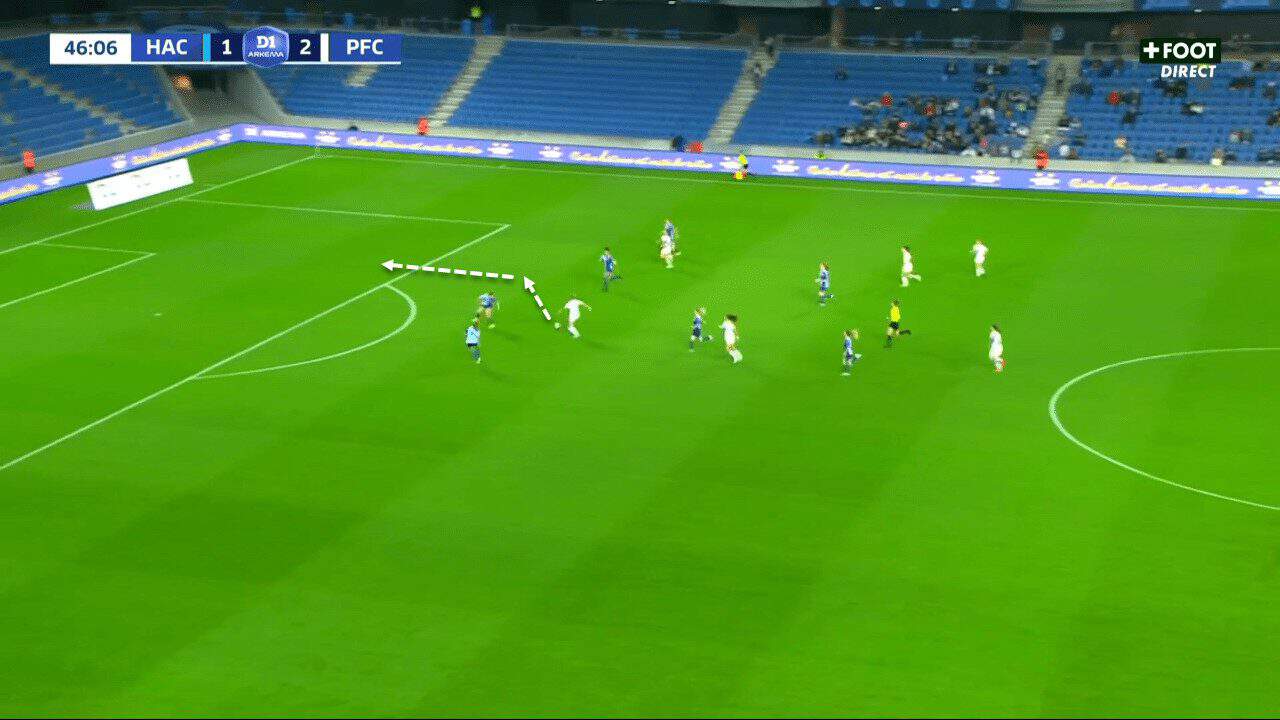The following example shows in a clear way how Fleury came from the left wing to penetrate Le Havre’s defensive line while asking for the ball at the back of the defensive line. This might look like a simple move and action, yet it requires a lot of chemistry and understanding between both players, as Fleury’s movement and the timing of the pass need to be spot on. Otherwise, the action cannot be finished successfully.