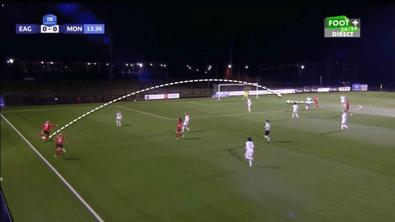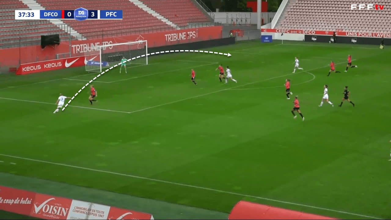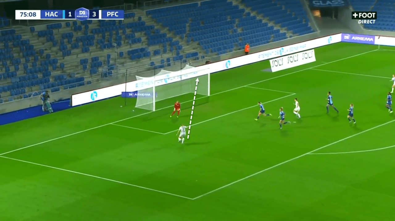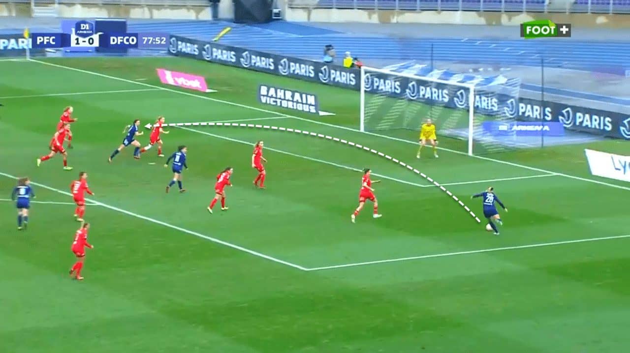 At the same time, she has proved whenever she played on the right wing that she can be dangerous on that side, as well as using crosses with the right foot to create dangerous opportunities and sometimes goals. This excellent cross highlights Fleury’s ability to remain impactful even when used as a right-winger, even though she is not used in that position so often.