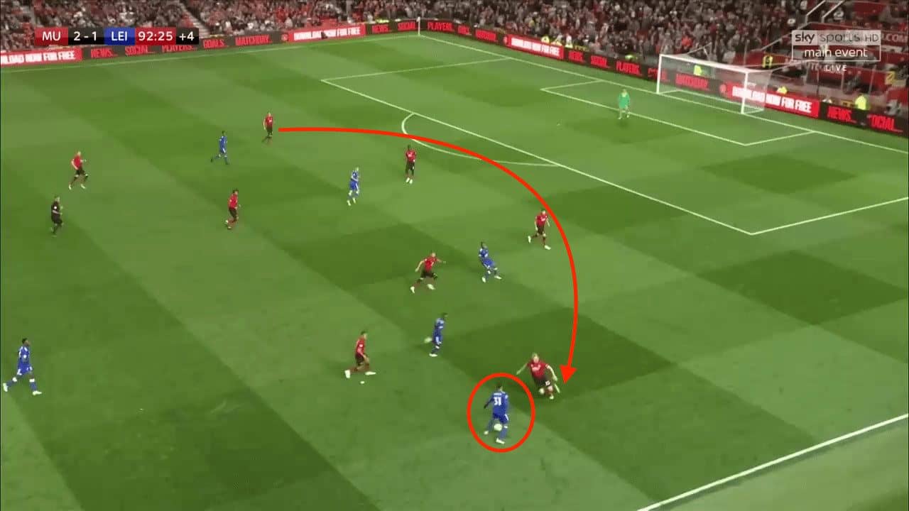 Even in the final minutes against Leicester City, Luke Shaw is still showing the fitness levels to step up out of the defensive line. In this move, he wins the ball from the opposition right-wing but he is more in line with his midfield than fellow defenders. This is where he can add real value. His ability to pressure quickly can help Manchester United transition from defence to attack. It will also help them play further up the pitch, which can help them unlock chances against lower level opposition.