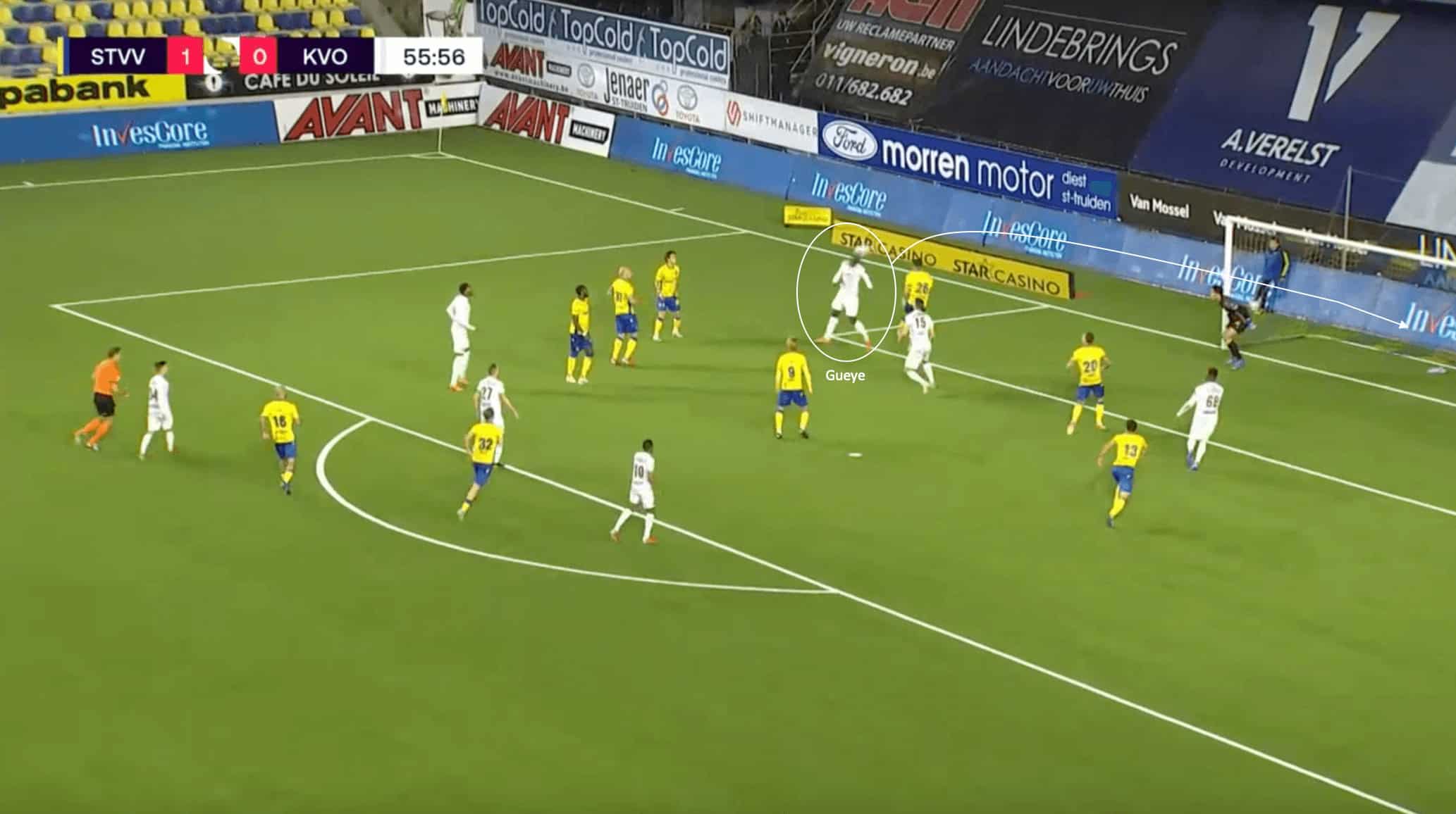 With Oostende, Gueye was a threat when it came to attacking set pieces and crosses sent into the penalty area from the wide areas.