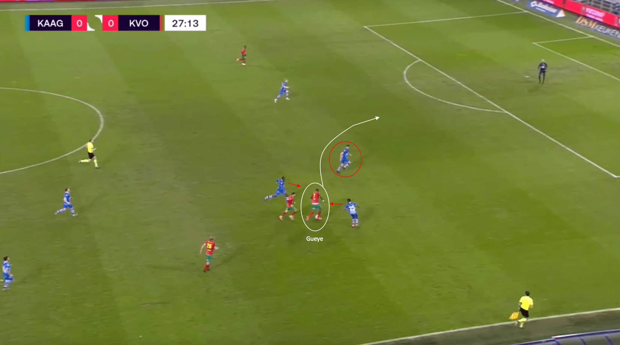 In this phase of play above, the Genk defenders look to press and close Gueye down as he is in possession, with his only thought to continue driving towards the goal no matter what.