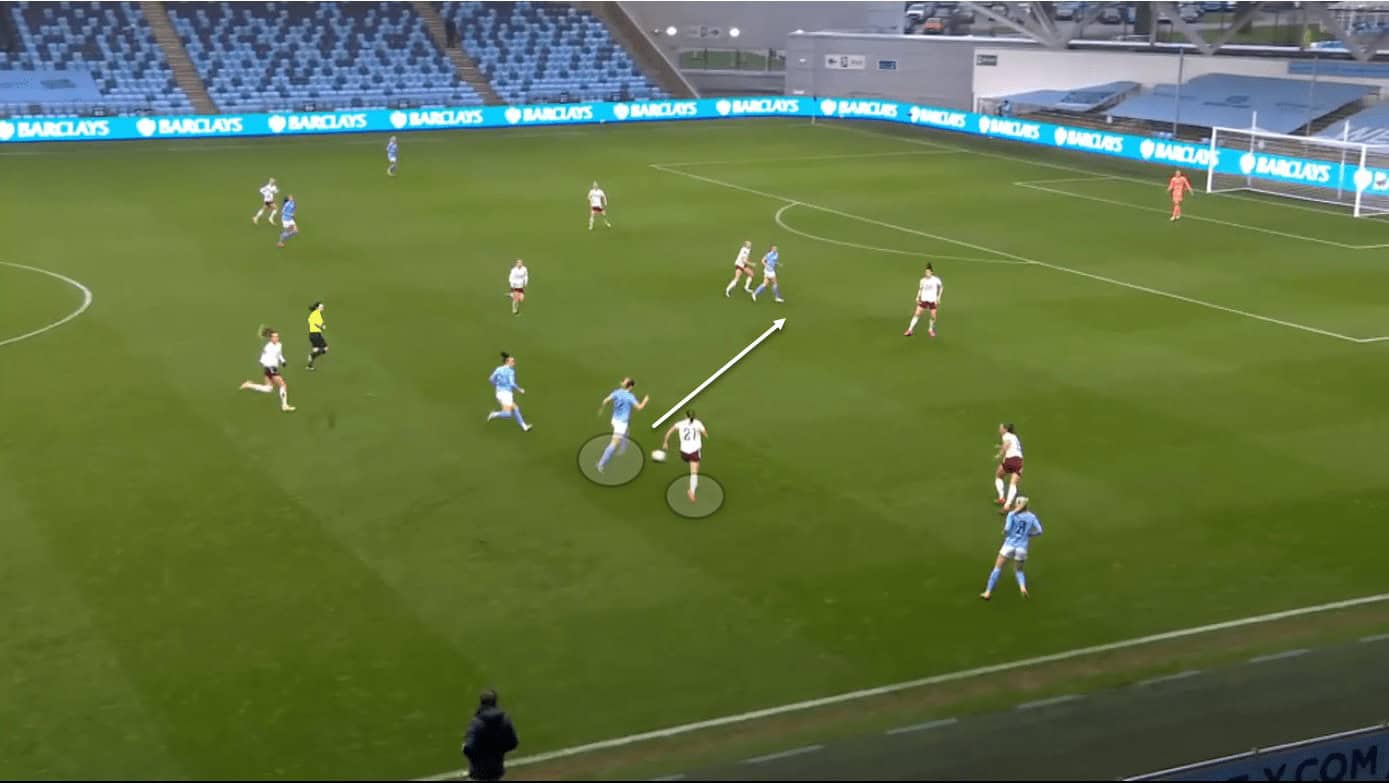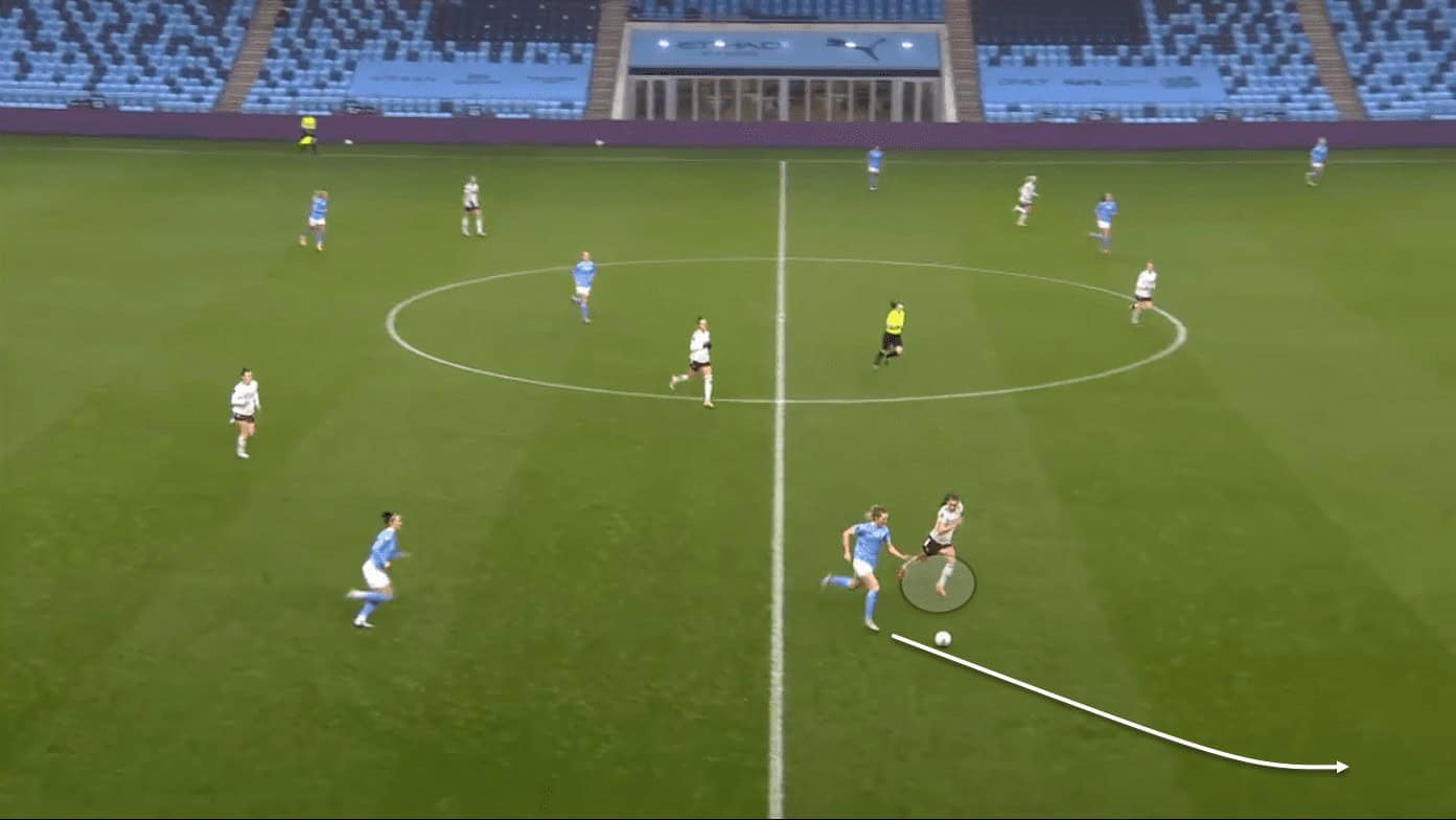 The above example from the game against Manchester City shows Gut’s positioning in a defensive situation. Here she is trying to chase down Sam Mewis and though she’s in a good position to tackle her, Mewis is able to get the ball past her by passing it out wide.