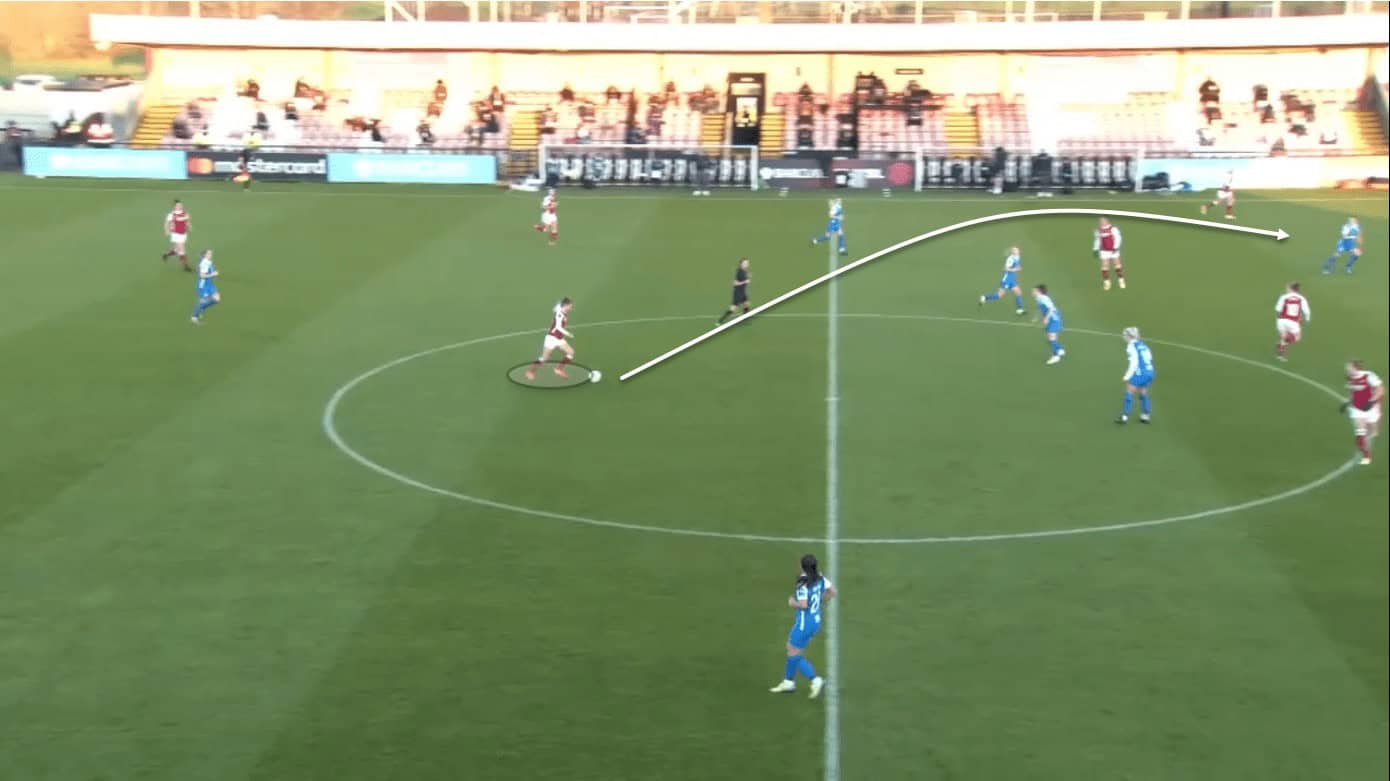 The example shows us how quickly Gut can take the ball from defence to attack from her ‘regista’ role. When she gets possession from one of the centre-backs she’ll often step forward and keep going if she’s afforded space as she has been in this situation. Gut will look towards the wide players and try to identify the best option and in this case, she found the left-winger which puts Arsenal in Birmingham’s final third. This creativity and vision is what makes her riskier passes much more effective. The combination of them both is raw but potentially lethal.