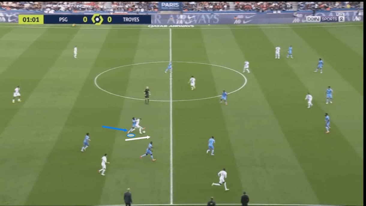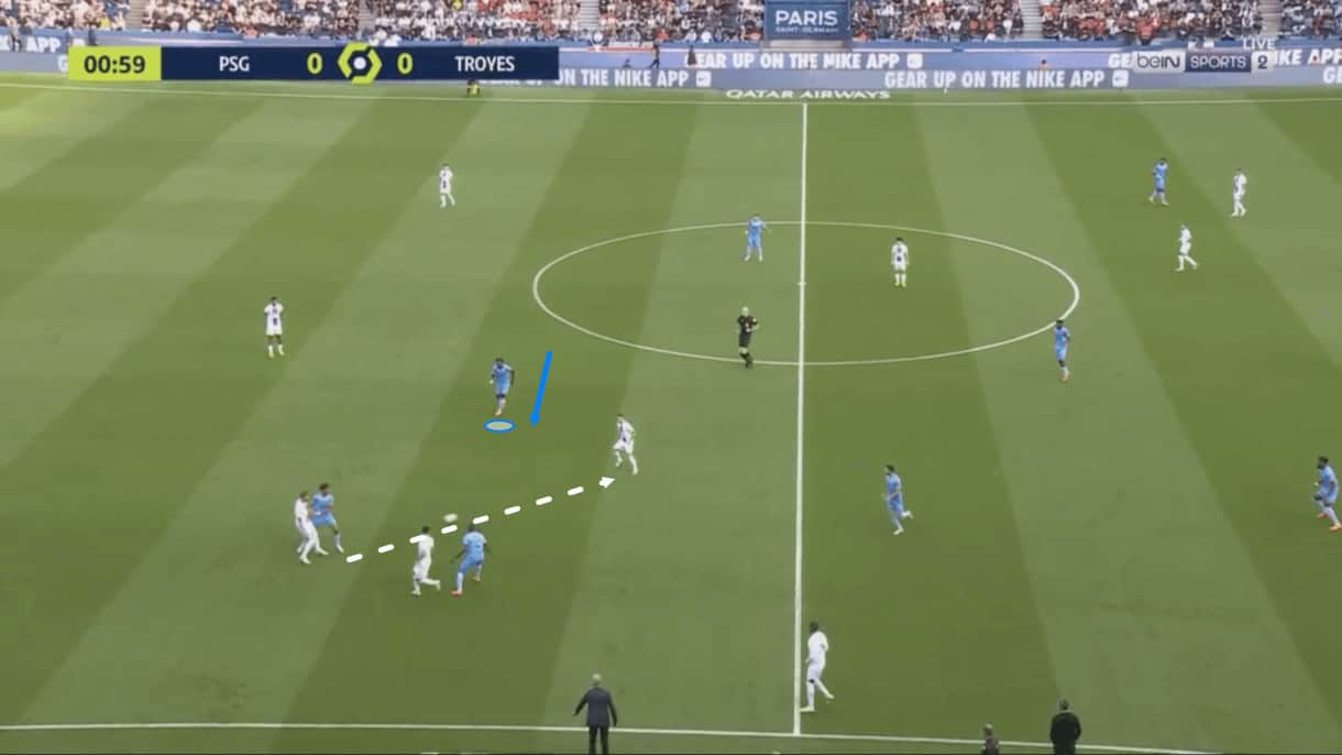 On this occasion, the opposition player was fouled and a free kick was awarded to PSG. However, while it would be better to win the ball cleanly, the most important part of Baldé’s role here is preventing progression one way or another, which he achieved with his intelligent defensive positioning at first, then solid work rate to close the ball carrier down quickly. This is a good example of the forward’s role in the mid-block phase of play.