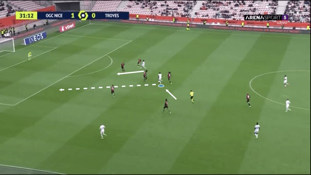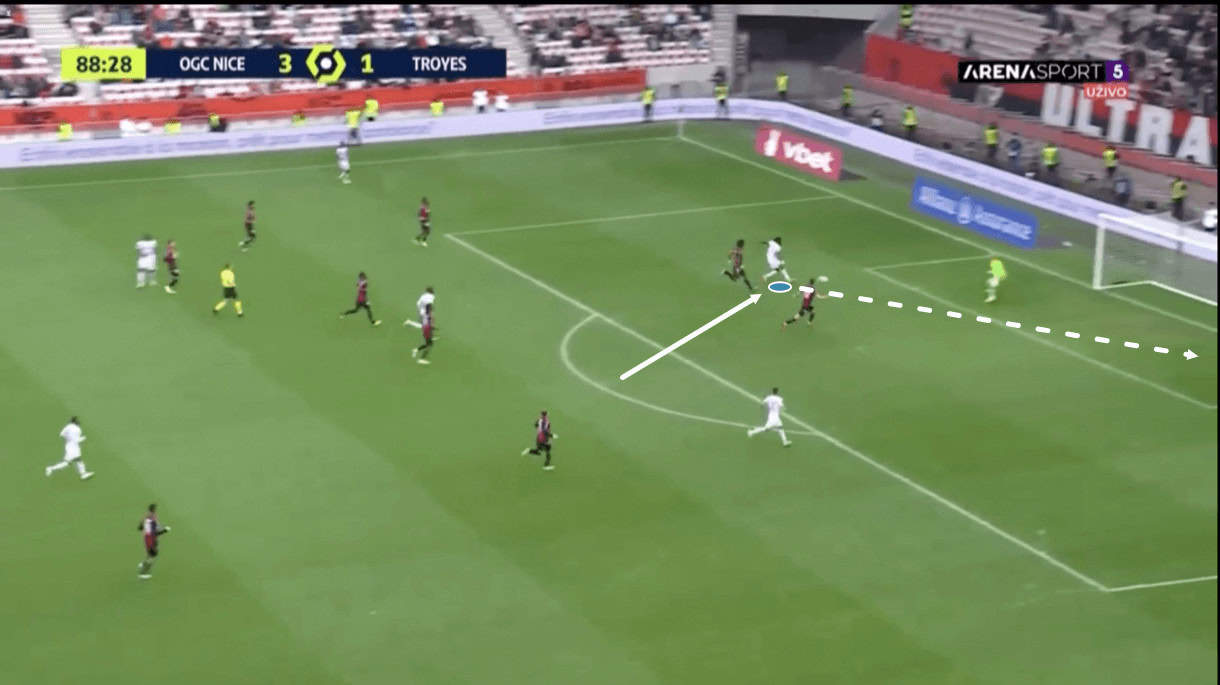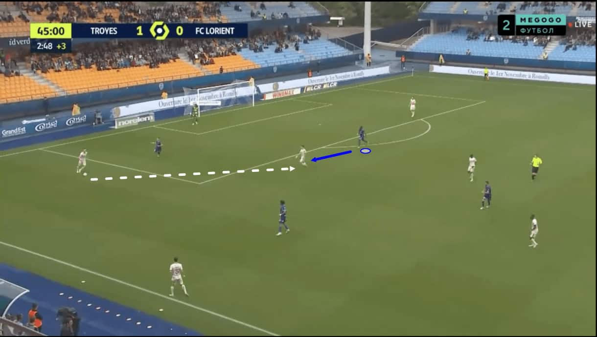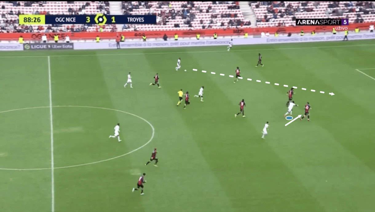 While they aren’t the most aggressive team in Ligue 1 in defending from the front, Baldé still has an important job to do in the defensive phases. The attacker is required to press aggressively on certain pressing triggers, and his defensive awareness along with work rate are key to Troyes’ defensive system working as intended, allowing them to generate the counter-attacks they aim to create.