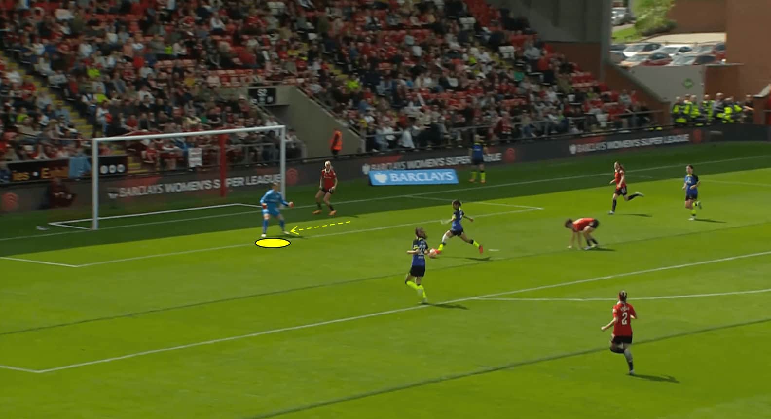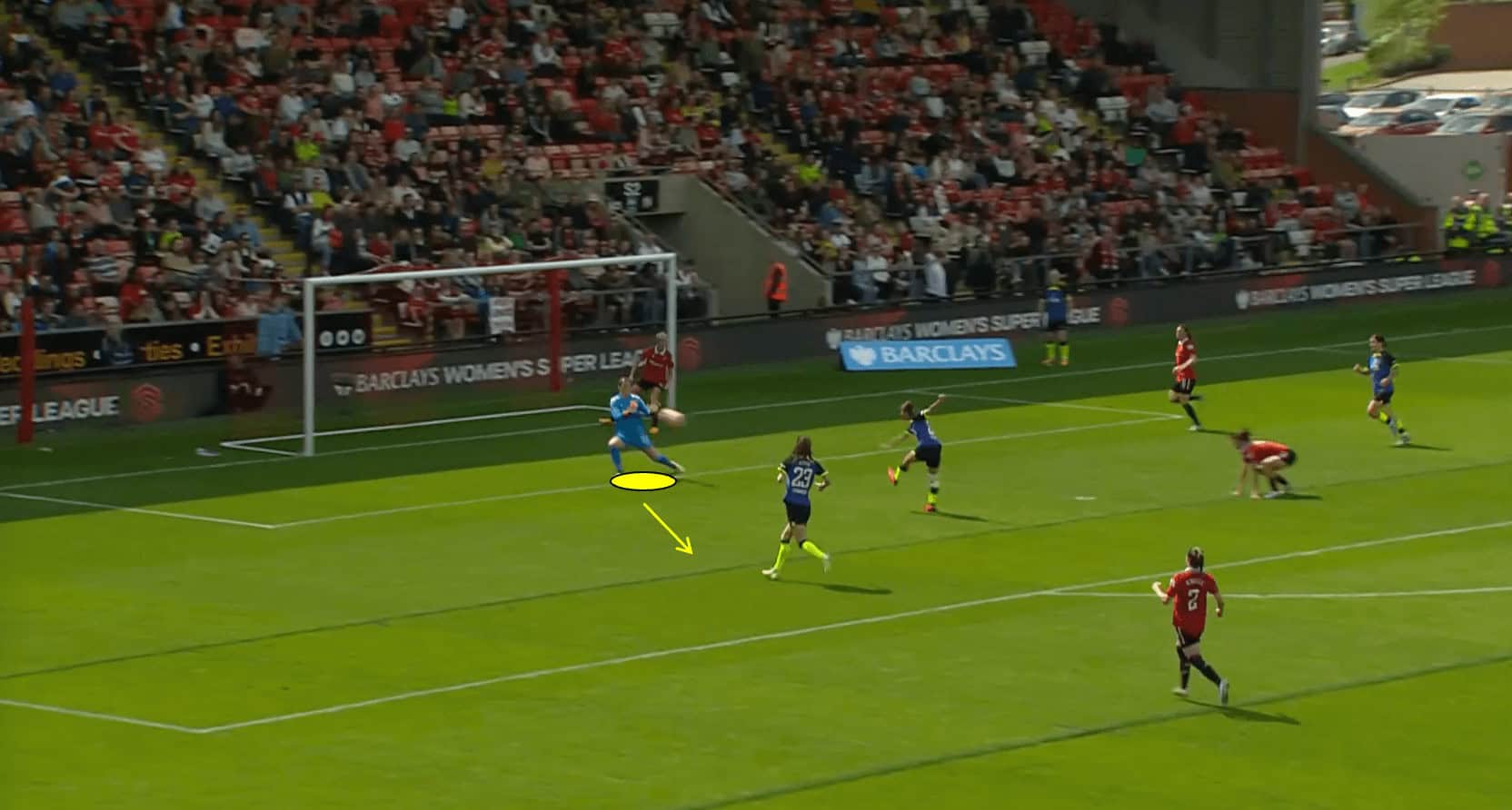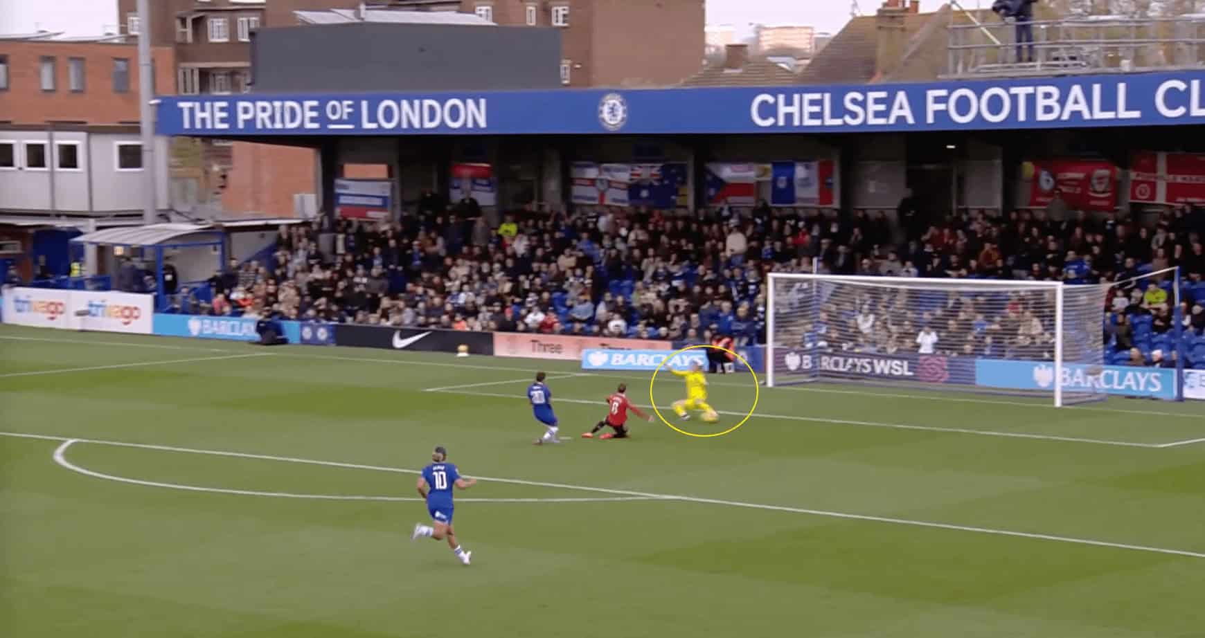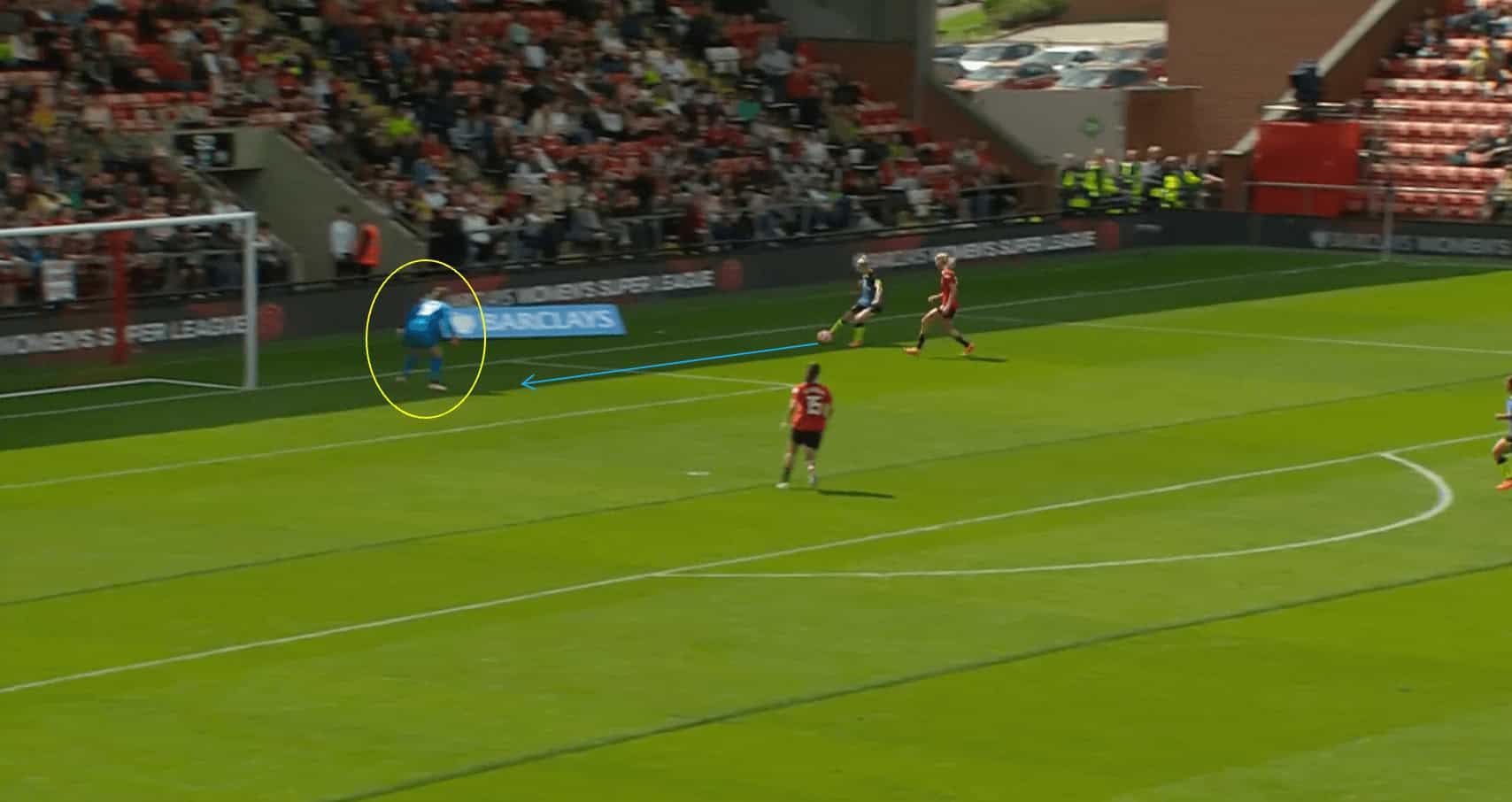 In the scenario depicted above, we can see that the Man United goalkeeper closes down the angle at her near post, which prevents Tottenham Hotspur forward Bethany England from being able to get a shot on goal.