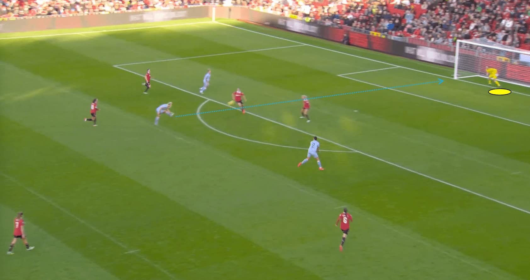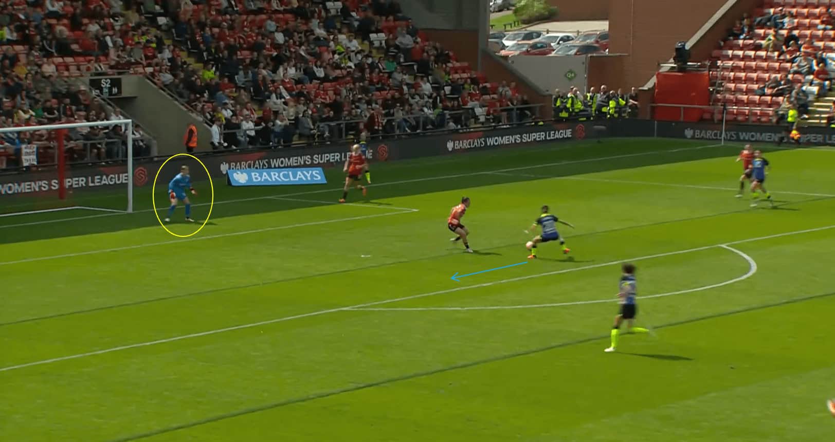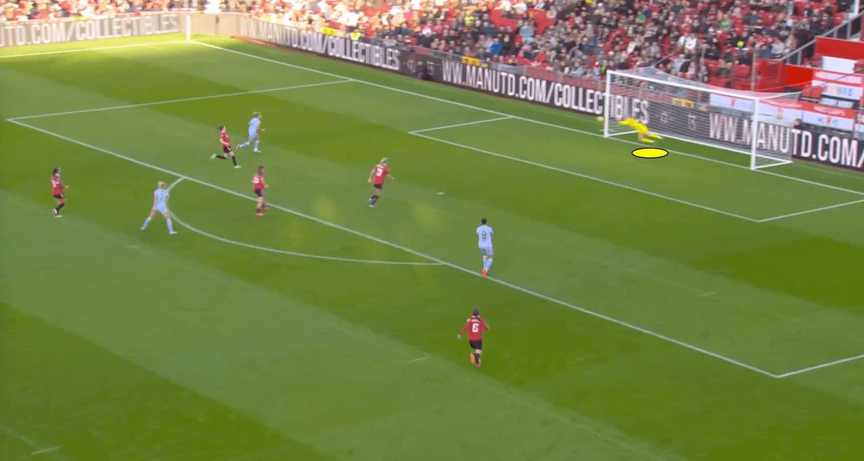In the scenario depicted above, we can see that the Man United goalkeeper closes down the angle at her near post, which prevents Tottenham Hotspur forward Bethany England from being able to get a shot on goal.
