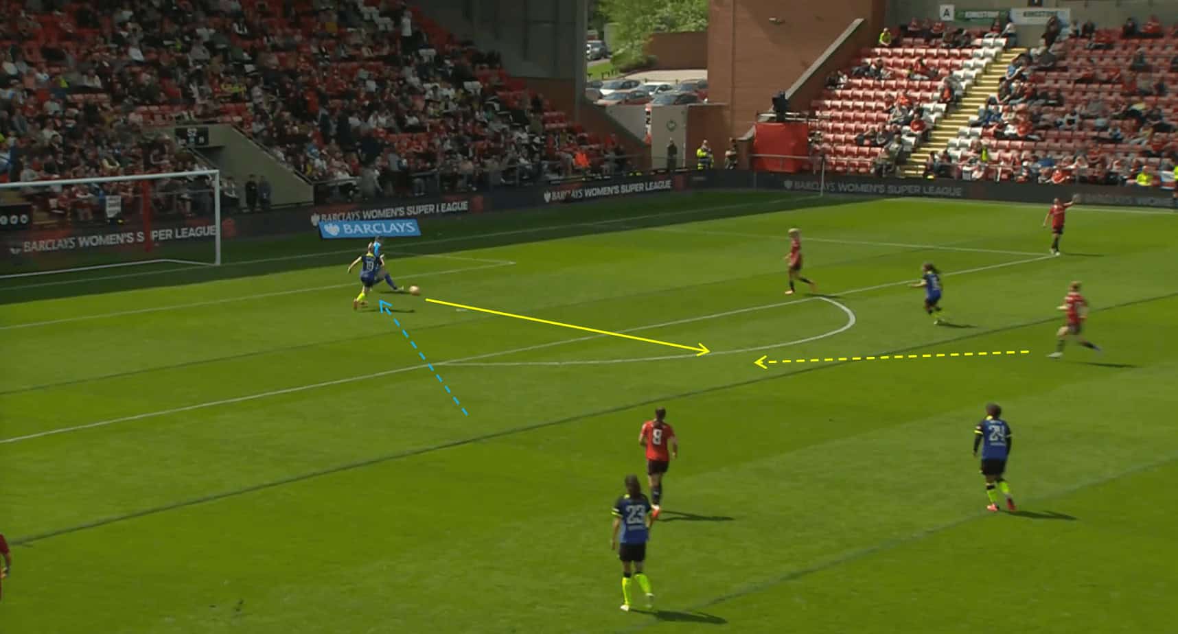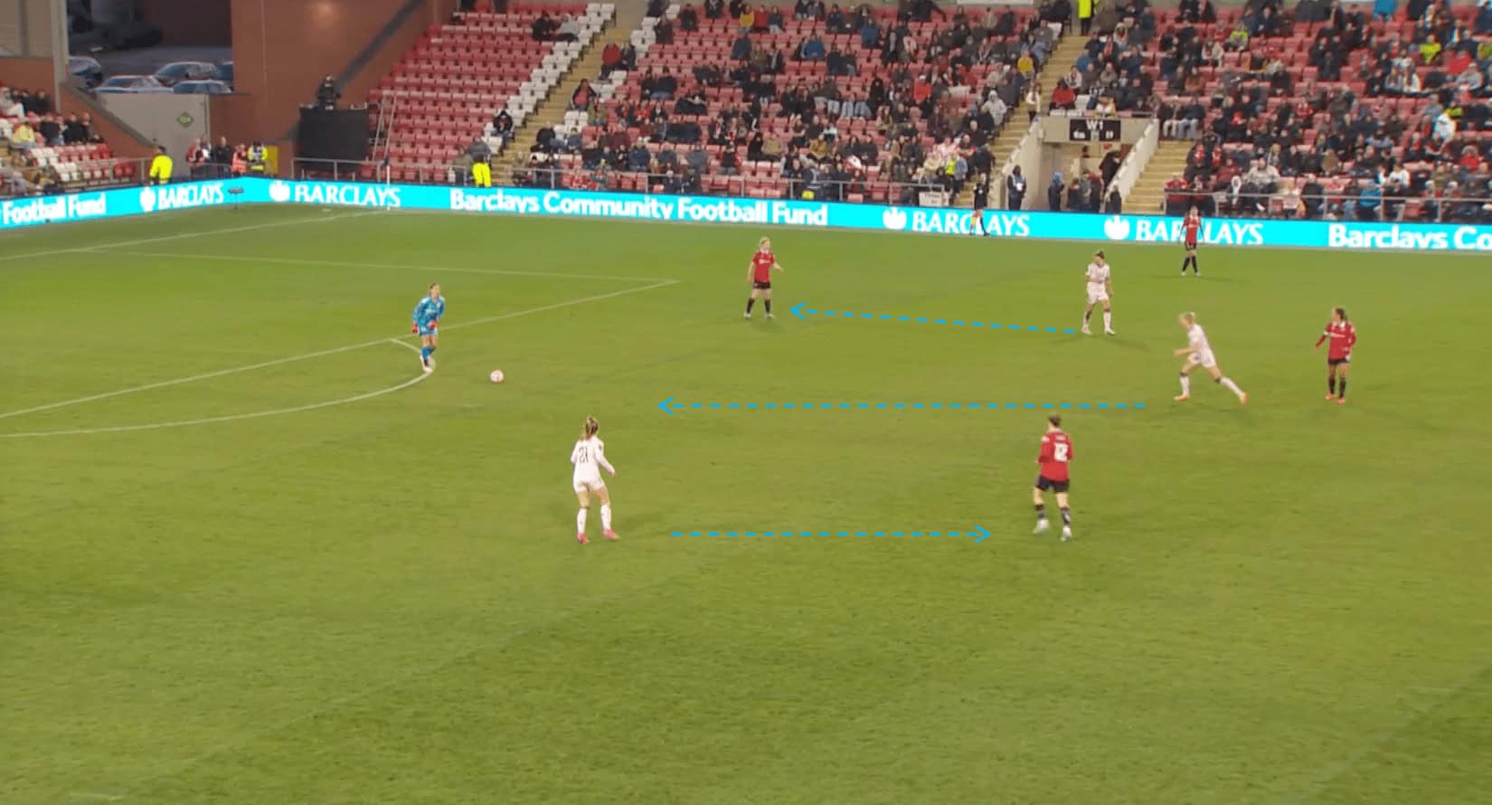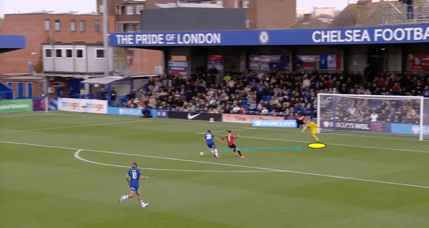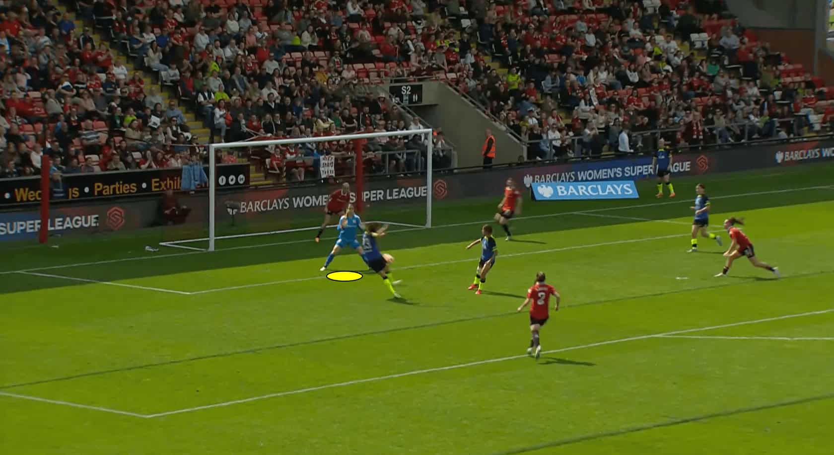 In the scenario depicted above, we can see that the Man United goalkeeper closes down the angle at her near post, which prevents Tottenham Hotspur forward Bethany England from being able to get a shot on goal.
