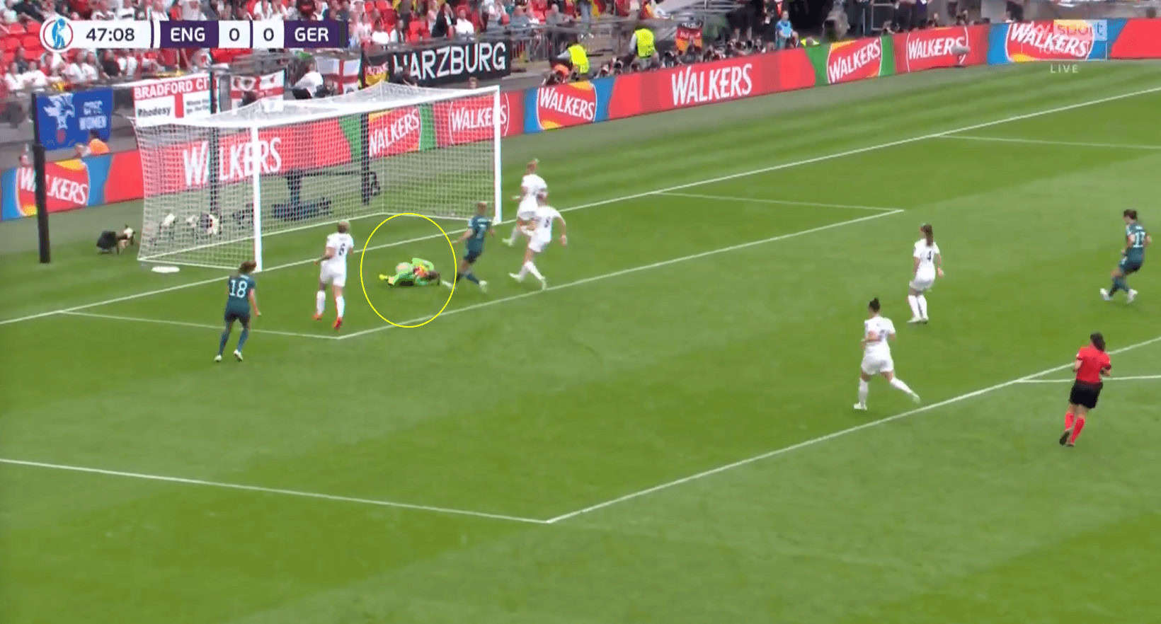 With no other option, the German attacker shoots towards the far post, but Earps gets down quickly and collects the ball, using her body to ensure she retains a tight grip and that it does not spill out of her hands and fall at the feet of an opponent.