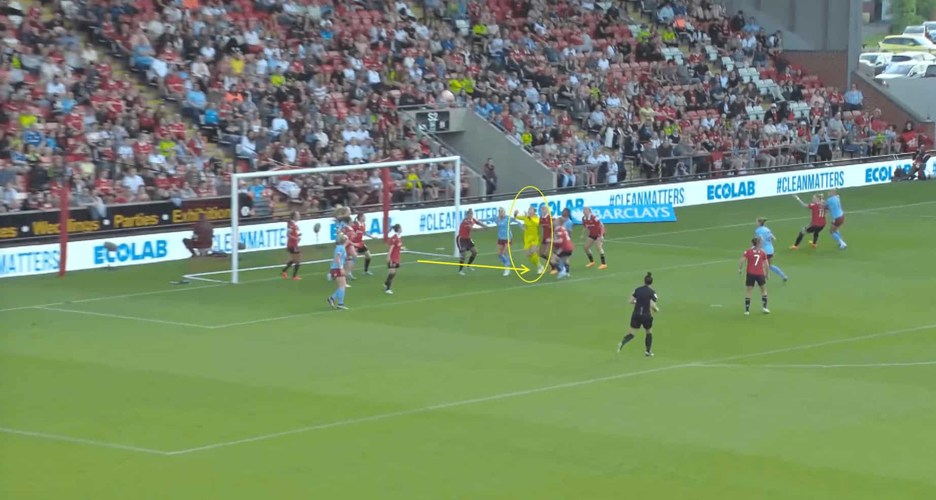 We can see here that Earps is confident when she does come off her line and watches the ball despite the players surrounding her. In this scenario, she remains rooted to the ground until the ball is on a downward trajectory. Then, she calmly reaches above the surrounding players to collect the ball.