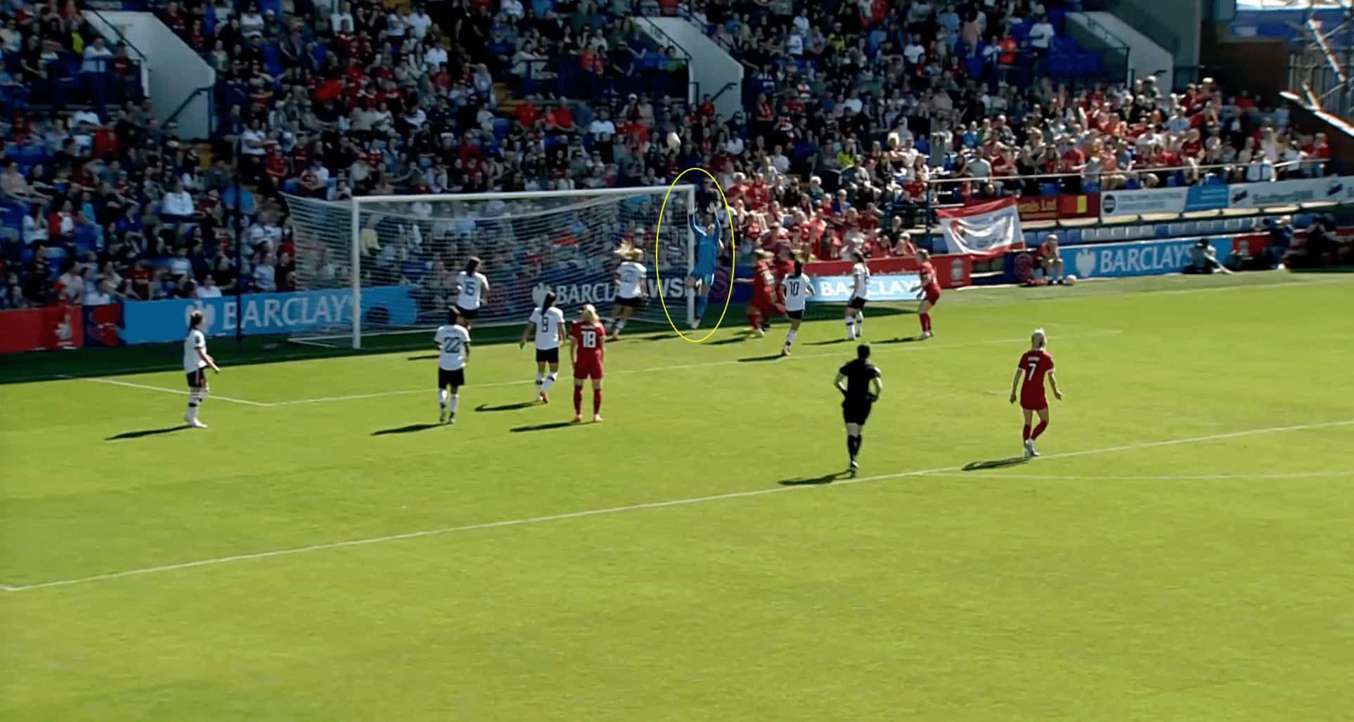 On this occasion, the parry is not controlled well and lands at the feet of another Tottenham player. However, Earps displays excellent speed and awareness to get up quickly and once again make herself as big as possible. This time, she makes the save and parries the ball away, putting it out for a corner.