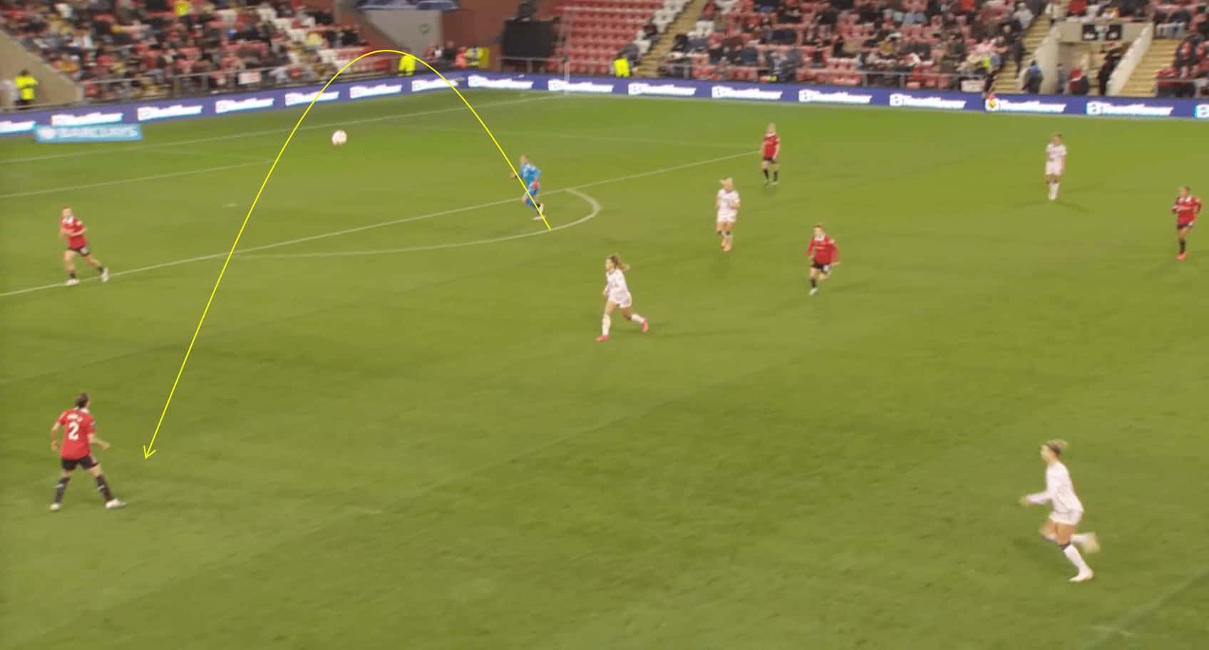 In this instance, Earps displays her ability to read the play well. She can see that Arsenal are looking to press her United teammates, which limits her options of playing a short pass. Instead, she sprays the ball out to Ona Batlle, who is free from an opponent and can look to build an attack.