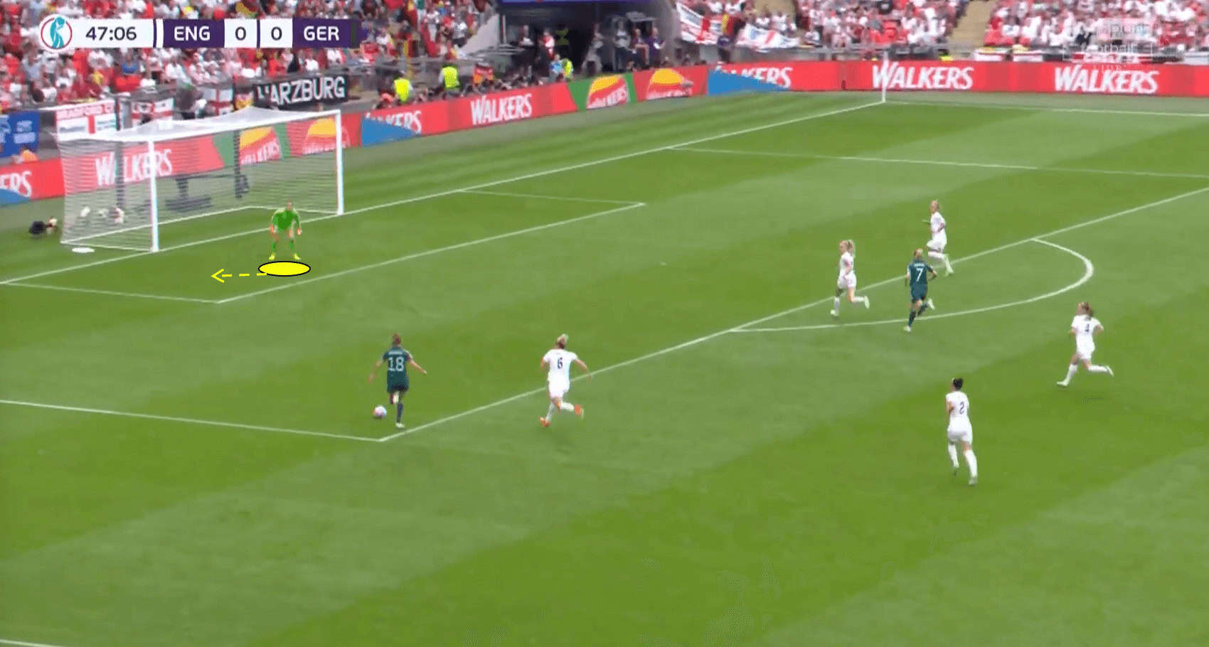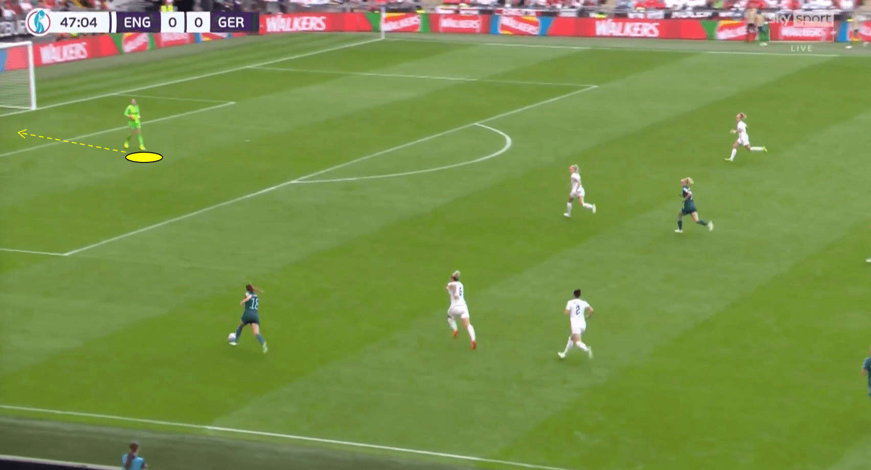 Instead, England pulls the ball back to her teammate, who easily outmanoeuvres her opponent with a nice side step. Earps has to adjust her position quickly; as we can see below, she moves forward to the edge of her six-yard box (it is rare to see Mary Earps actually leave the six-yard area; most of her ‘saving’ actions occur in the area).