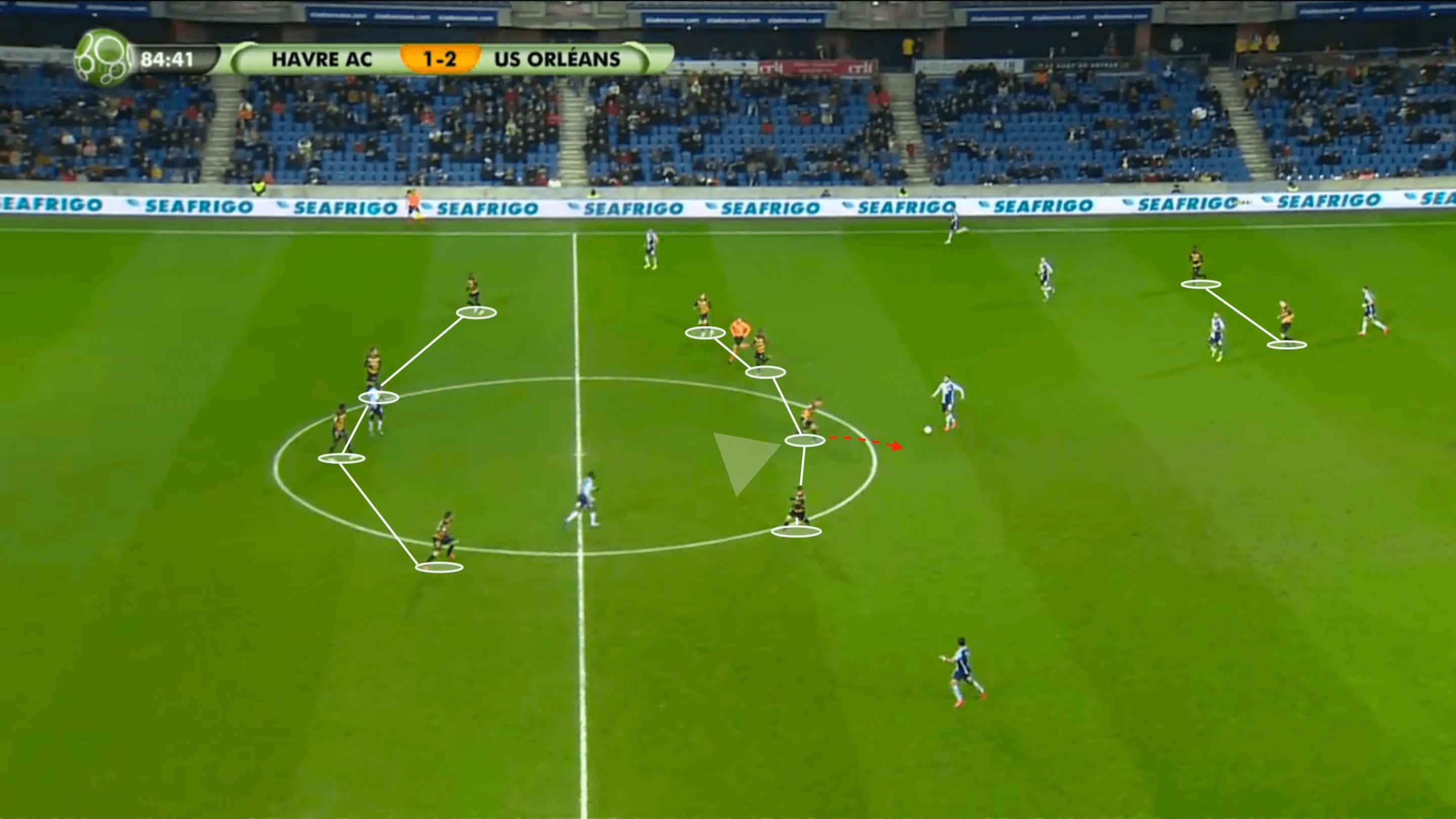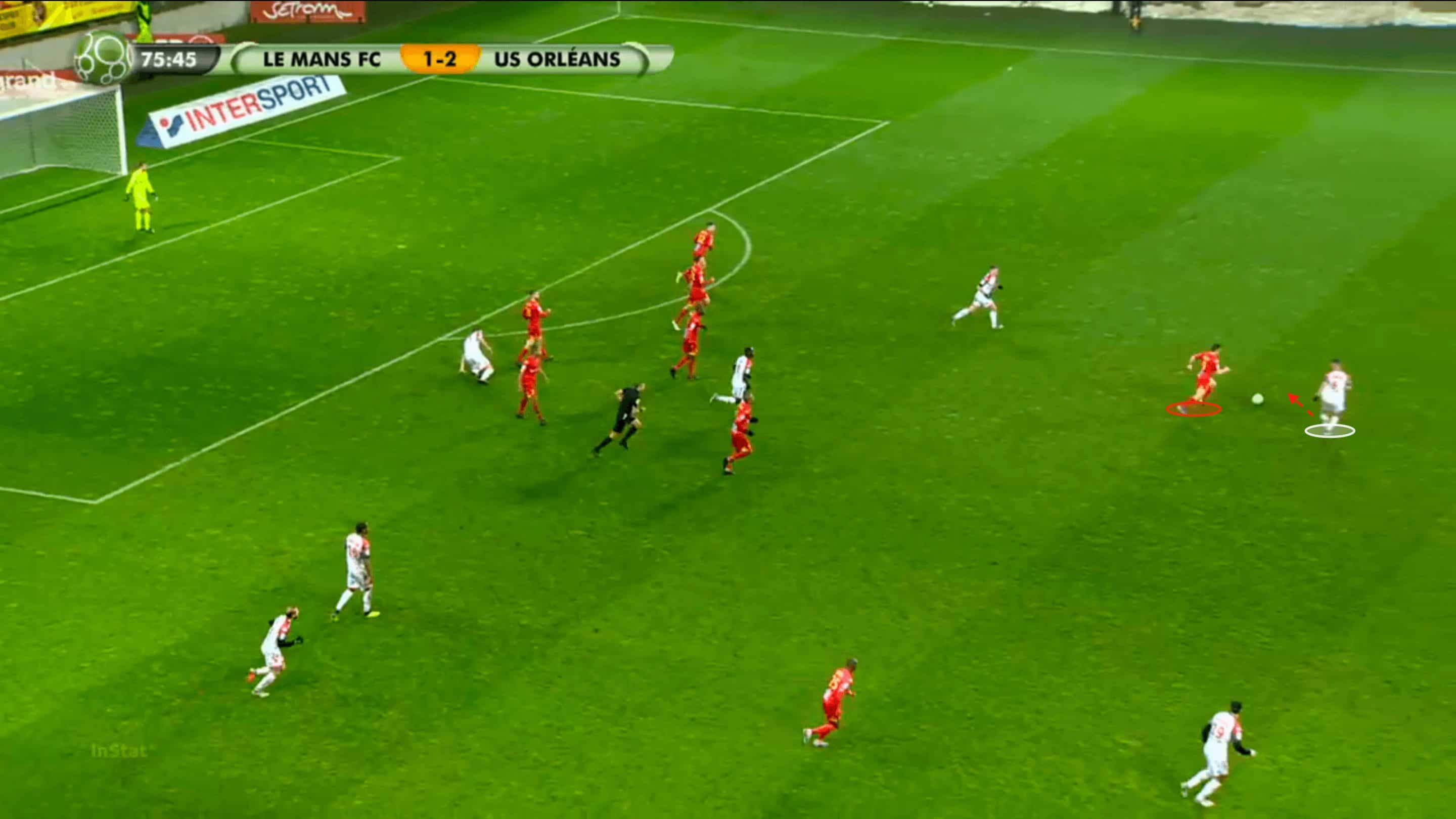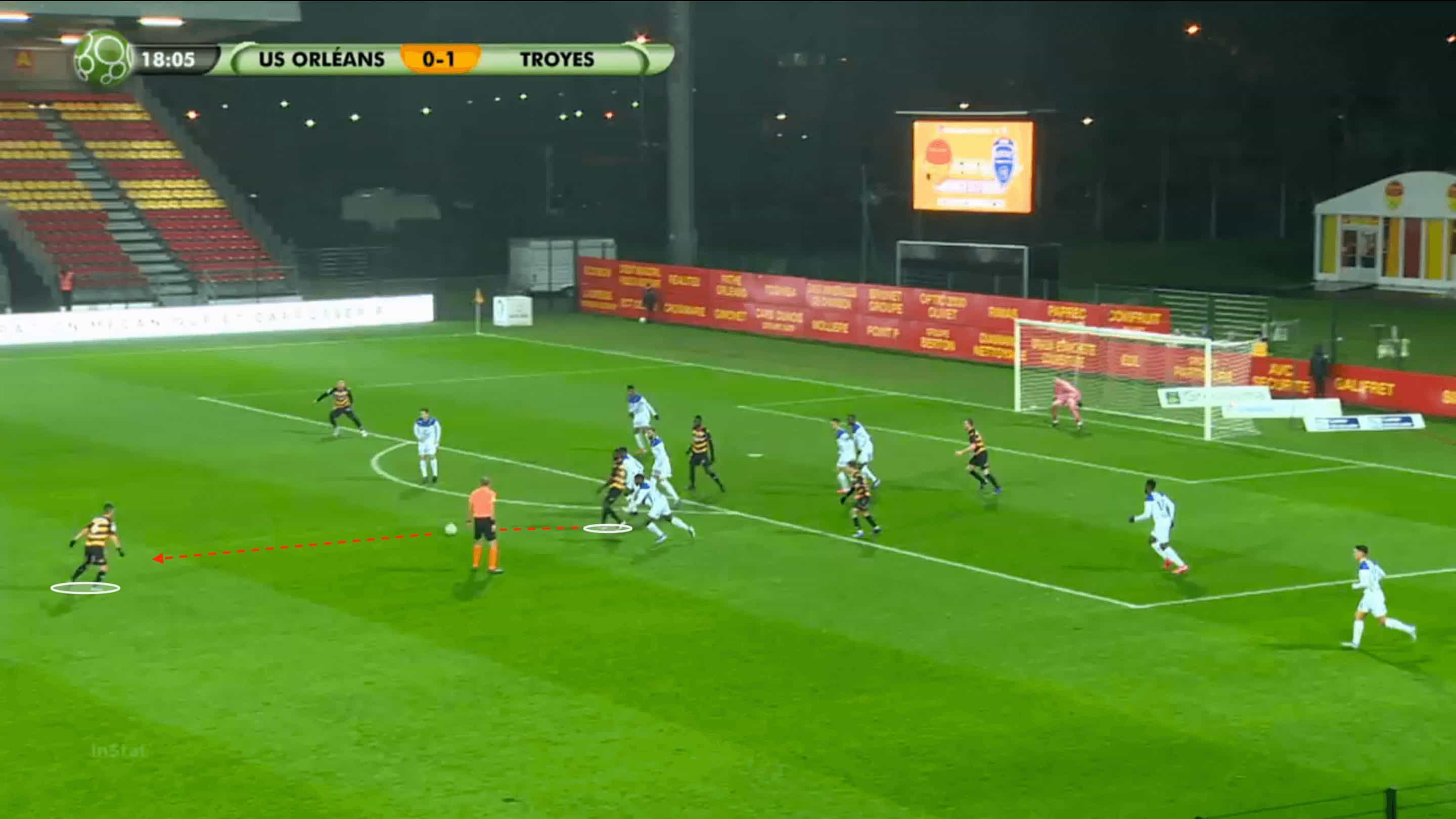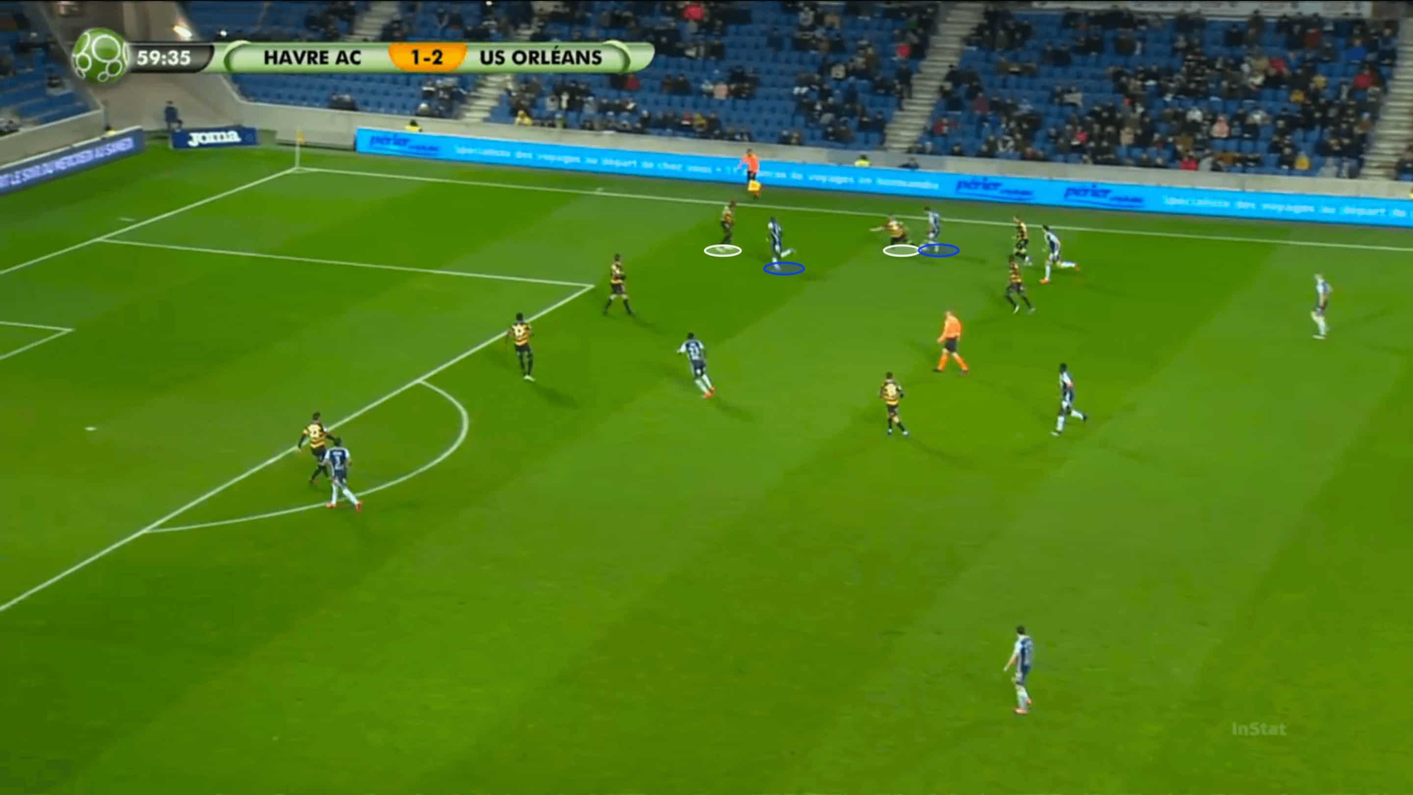 The image below shows D’Arpino providing cover in wide areas so that US Orléans don’t get overloaded by Le Havre. In this particular case his tackle was successful, but that doesn’t always happen and there is definitely room for improvement in this chapter.
