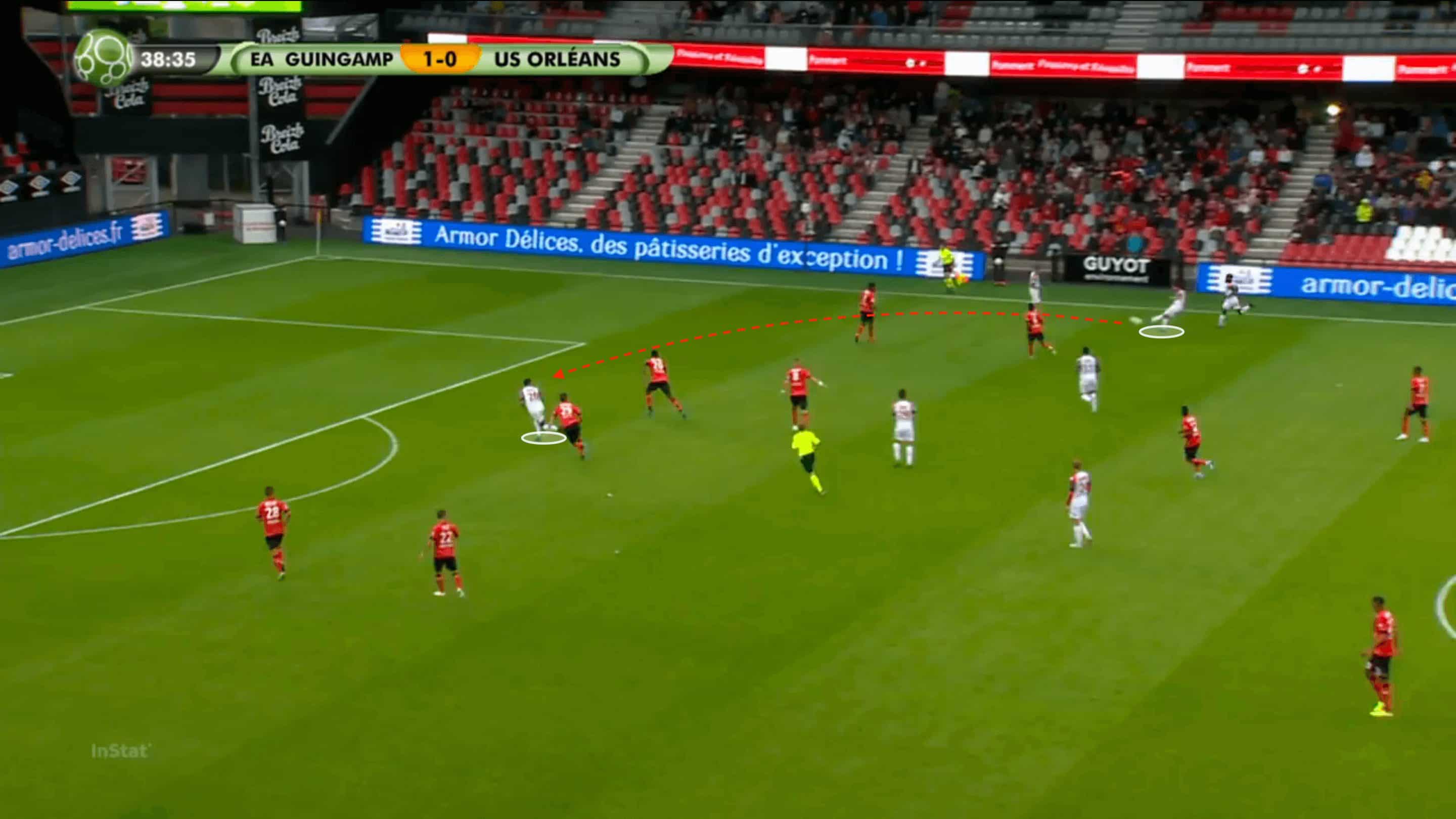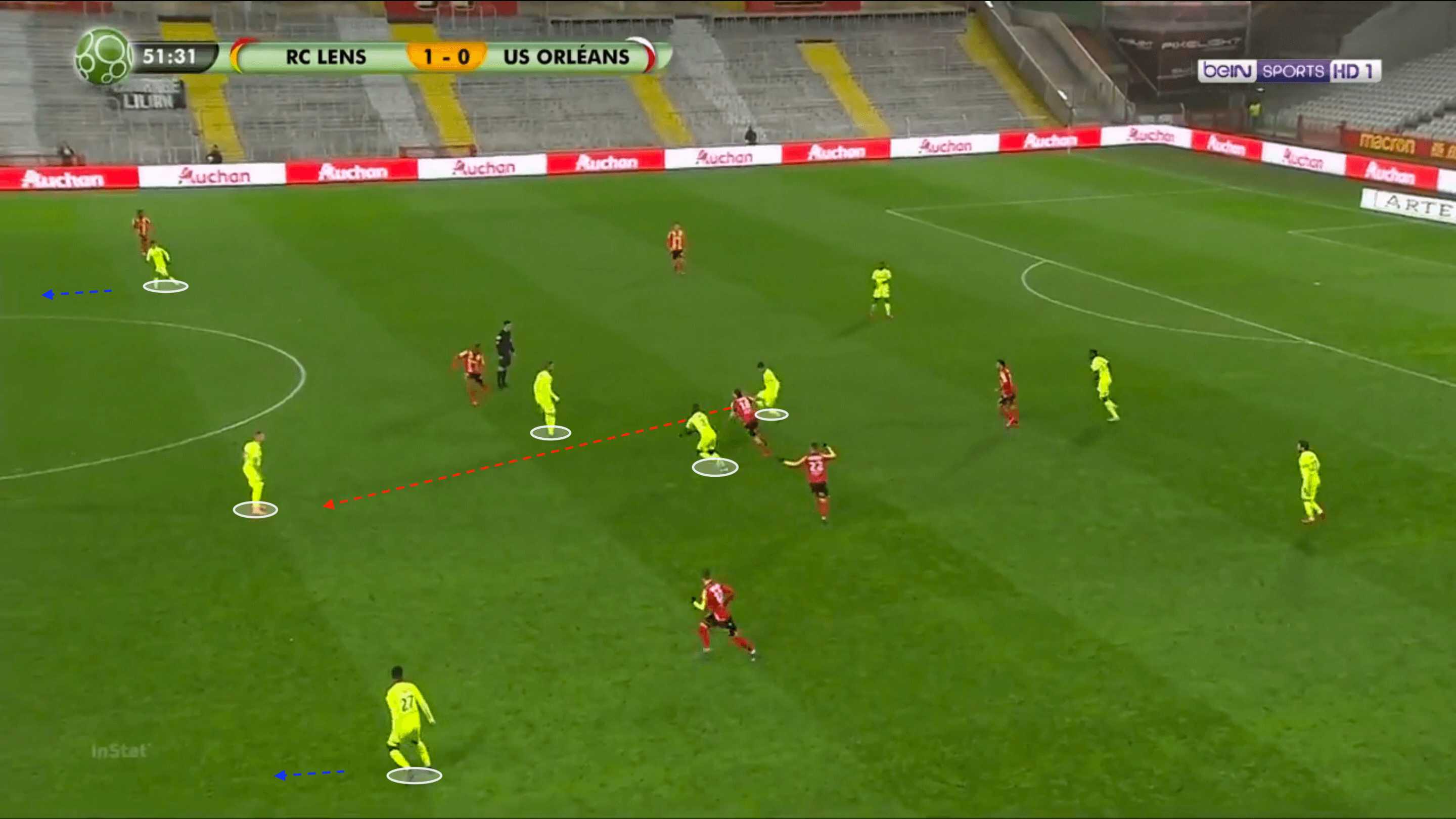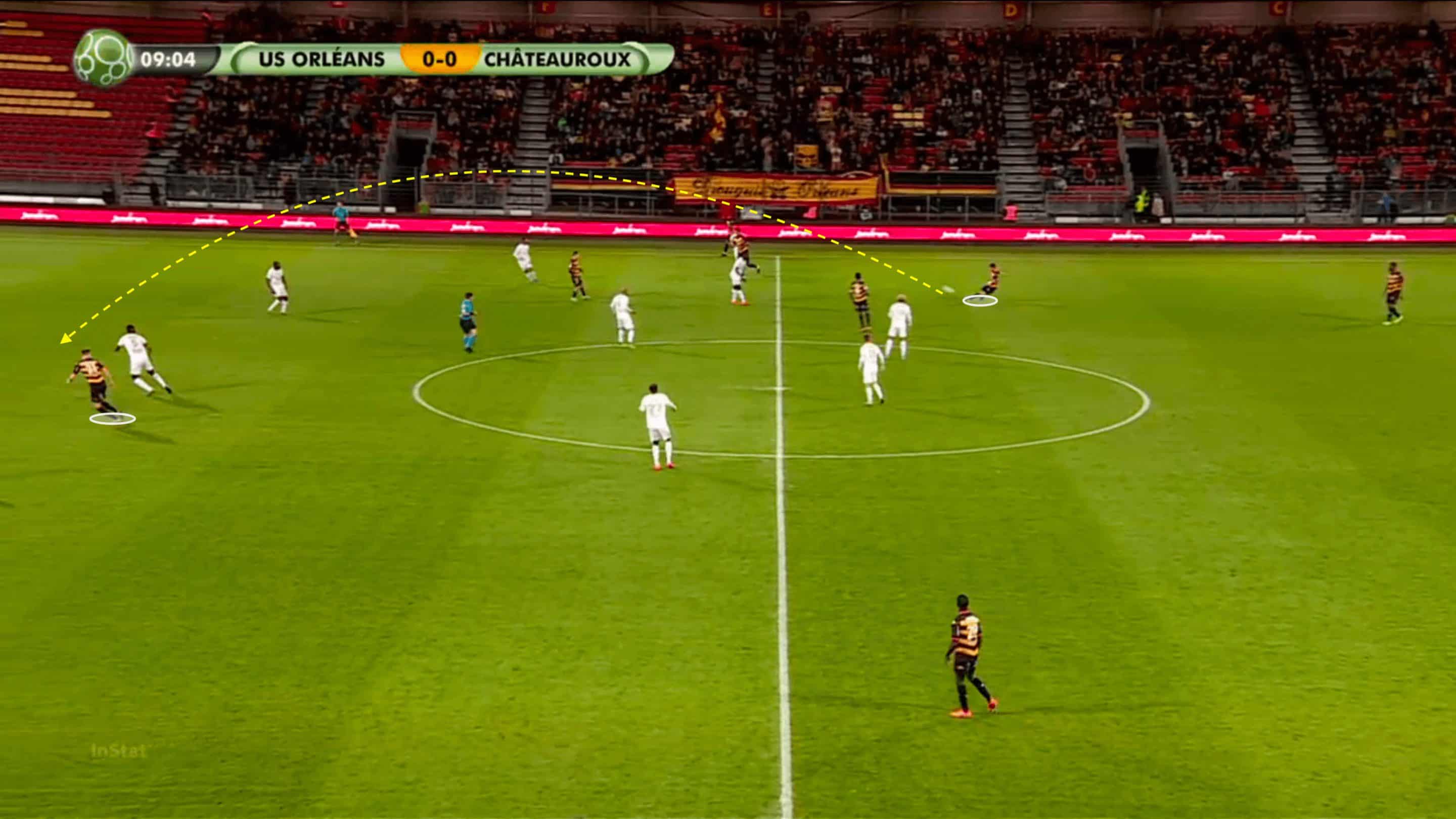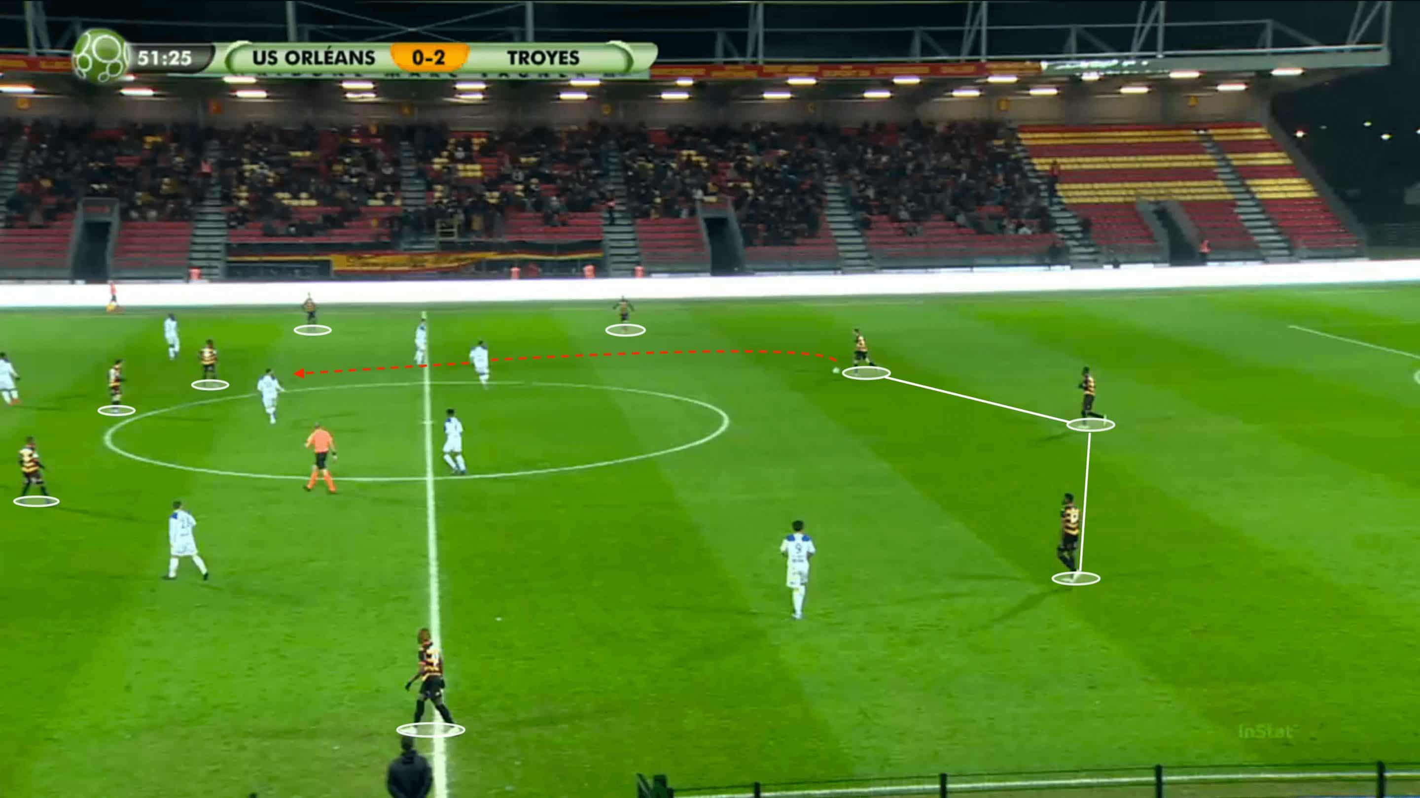 The image below shows D’Arpino providing cover in wide areas so that US Orléans don’t get overloaded by Le Havre. In this particular case his tackle was successful, but that doesn’t always happen and there is definitely room for improvement in this chapter.