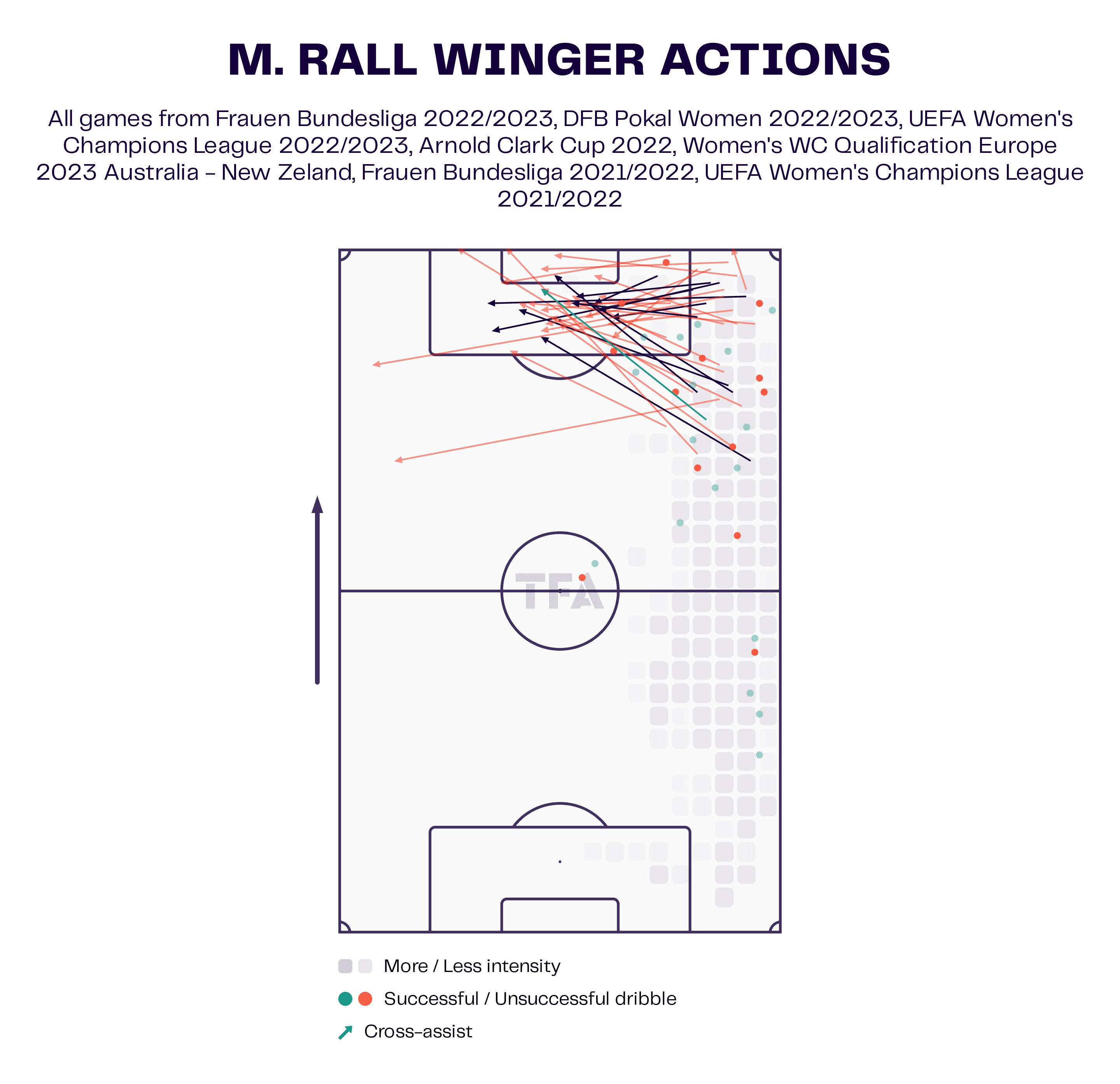 In order to further assess Rall’s attacking attributes and wing contributions when playing as a RB or as a RW, we used this graphic in order to resume her crossing and dribbling statistics mainly. In fact, the graphic clearly shows that Rall doesn’t rely too much on dribbling but rather on crossing and passing towards the box and sometimes towards the other wing. The arrows also show that Rall alternates between early crosses and deep crosses while mastering both of them. It is true that many of these crosses are orange and therefore not successful, yet Rall is not the only one responsible for this but the receivers of these crosses are the first responsible too if they don’t finish the action as needed.