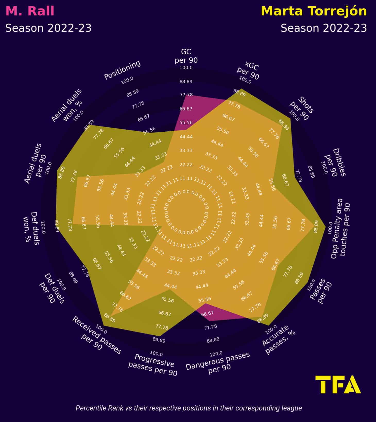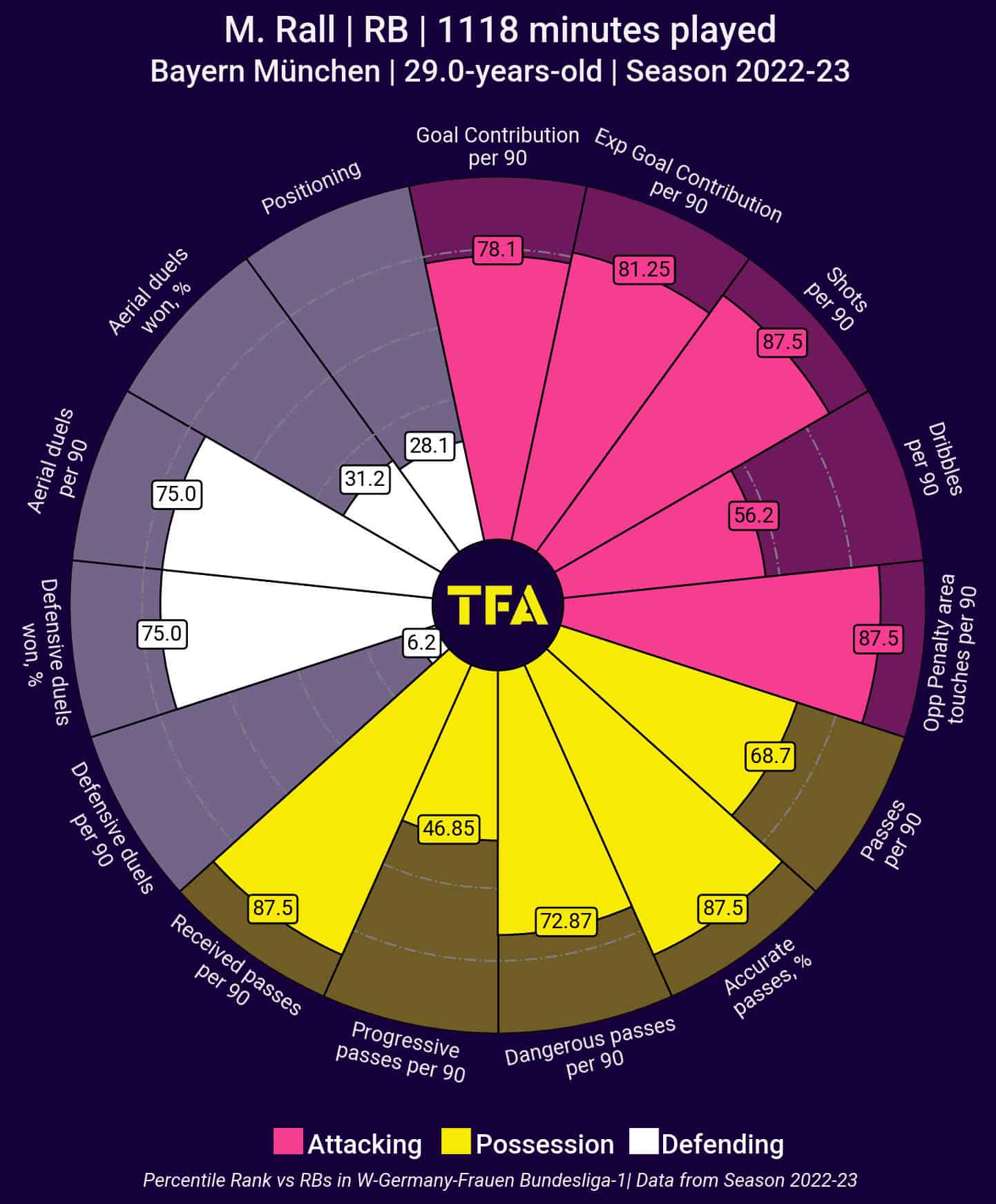 However, according to the pizza map, Rall’s characteristics are more of a winger than of a right-back and positioning her as a winger would benefit herself and the team she plays at more, especially from an attacking perspective. Therefore, we believe that the best strategy with Rall is to deploy her as a right winger mainly and use her as a backup for the RB, LB and LW positions. And since this was not really possible at Bayern Munich due to fierce competition on roles, moving to another club needing an excellent right winger would be a very suitable choice for Rall.