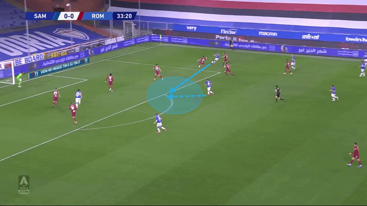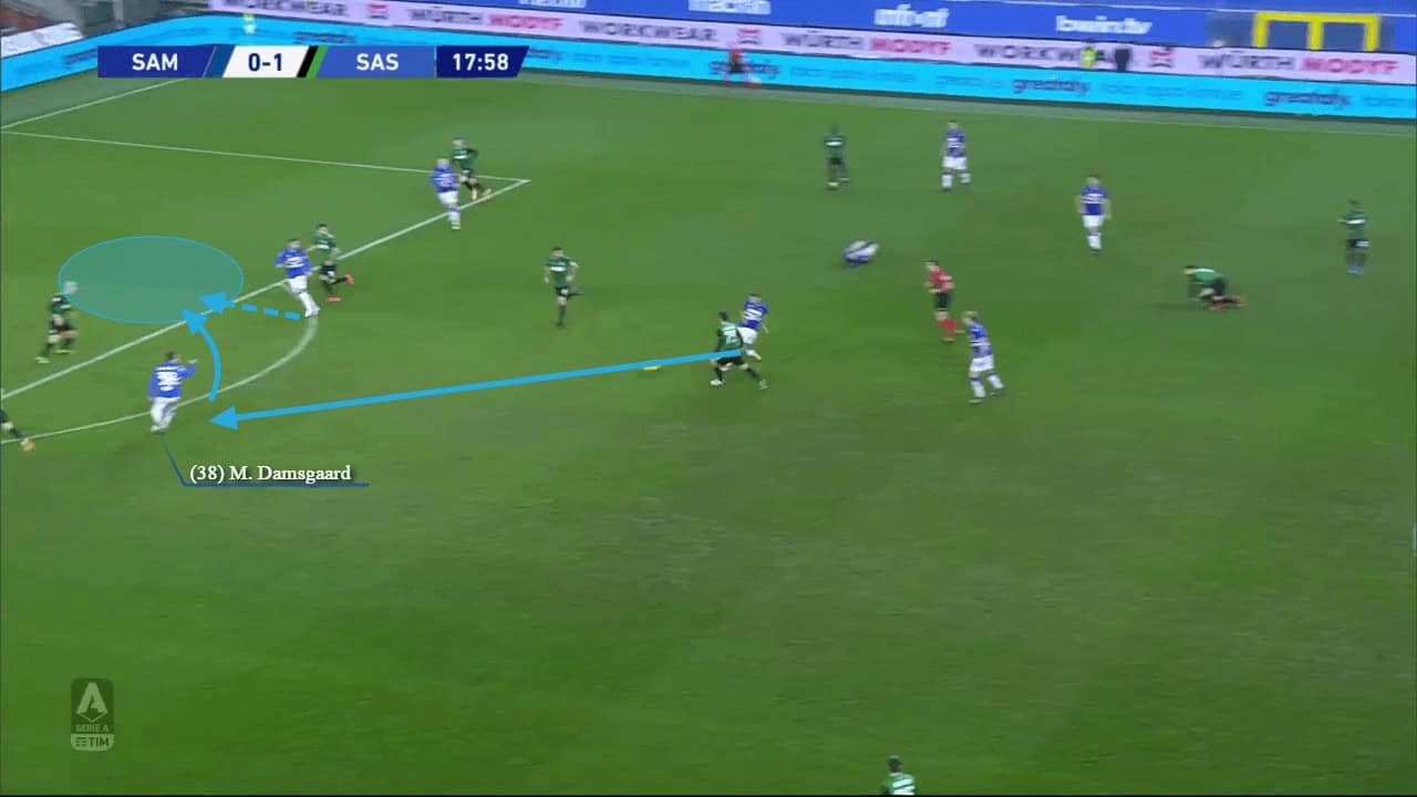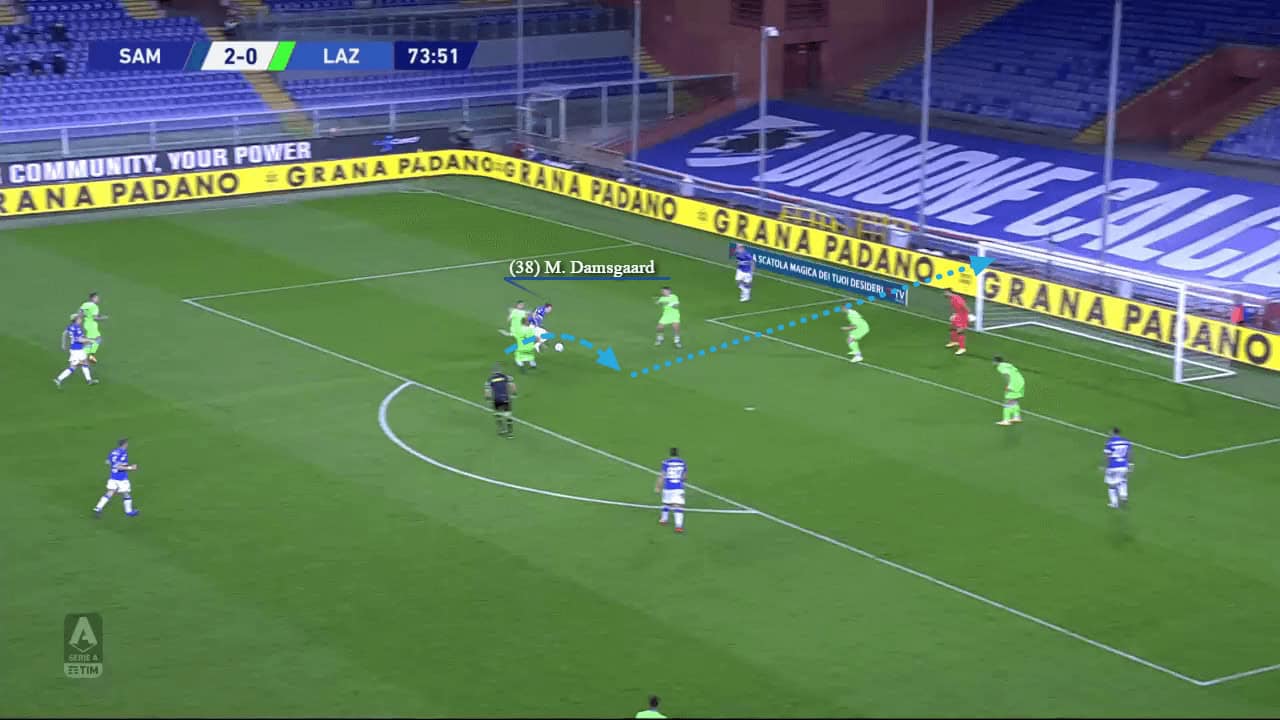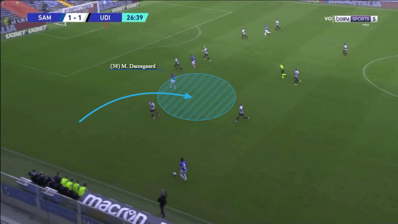 At Sampdoria, Damsgaard played most games as a left midfielder in a 4-4-2 with Tommaso Augello overlapping from left-back, although he was moved around from wing to wing and in central areas sometimes. Damsgaard is a versatile player who can rotate in most positions across the midfield and forward lines. Mikkel prefers to drift into central areas where he could get on the ball more often in more dangerous areas and dictate attacks.