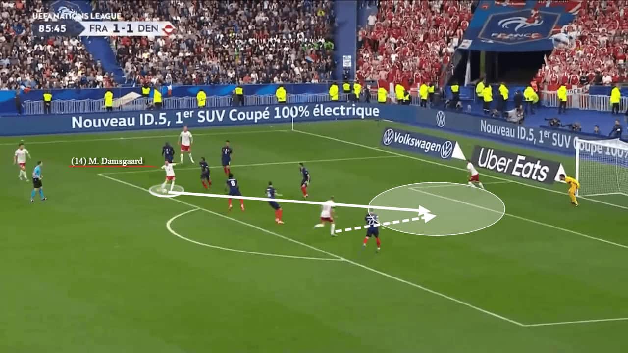 The ability to hit the ball with both power and precision keeps the goalkeeper guessing, and they’re less likely to predict where the shot will go. The image below displays Damsgaard’s superb ball-striking skill.