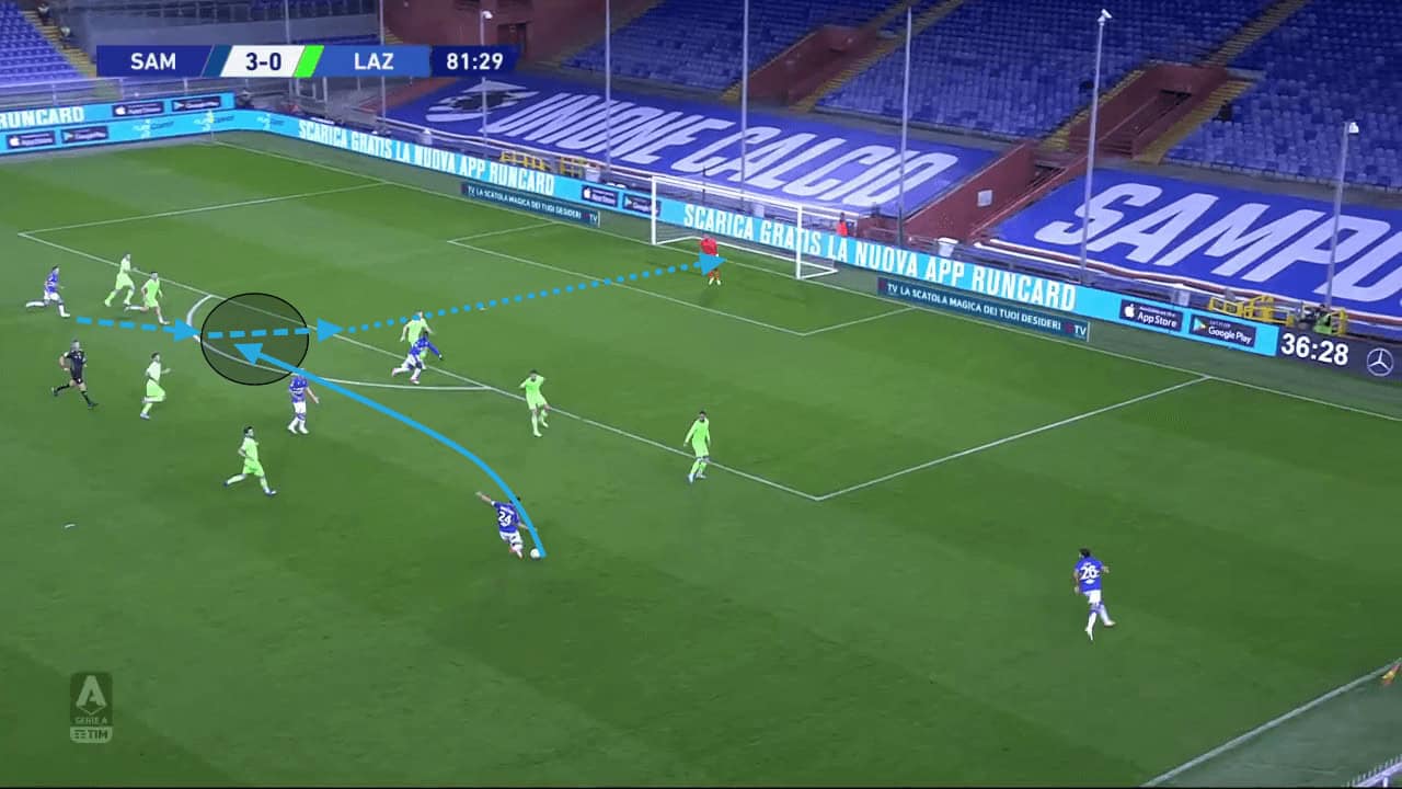 Another position where Damsgaard can slot in, is as a right-sided central midfielder due to the arrival of Aaron Hickey, an inverted wing-back comfortable playing on either side. Hickey, at Bologna, would invert into central areas during attacking situations due to his comfort playing with either foot in central zones. If Damsgaard starts as a right central midfielder with Hickey playing at right-back, Hickey will be able to move into midfield during settled attacks, covering for Damsgaard’s slightly weaker defensive abilities when counter-pressing and allowing him to move to areas closer to the opposition box where he can create dangerous opportunities.