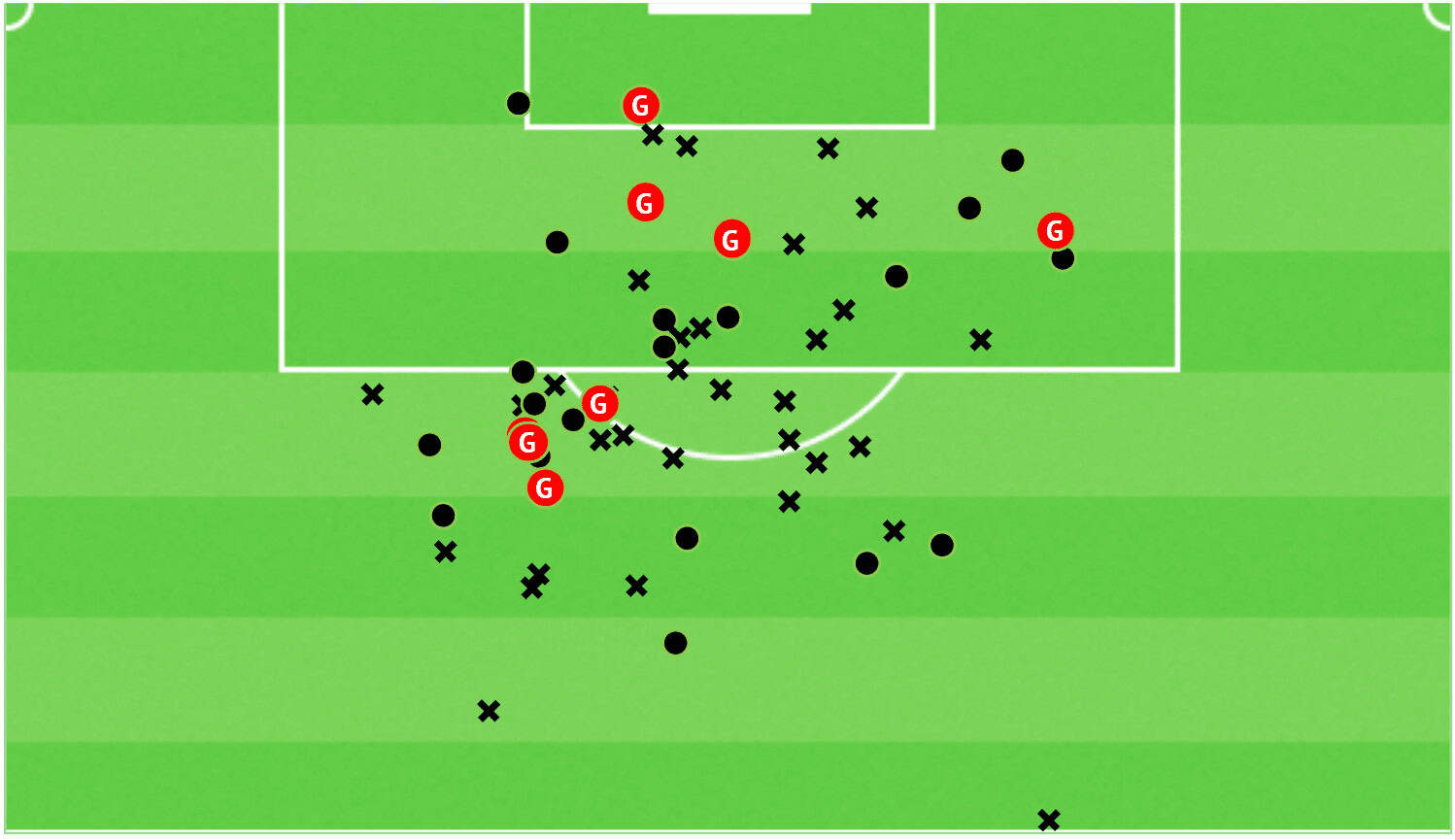 The first thing we need to mention before going into detail is that Ben Romdhane shoots a lot and scores from different positions. He has an excellent shot from distance, both in open play and set-pieces, and also gets into great scoring positions in the box. This unpredictability makes him a difficult to defend player and he uses that to his favour in his movements. The shot map below serves to illustrate how he’s a goal threat from different parts of the pitch.