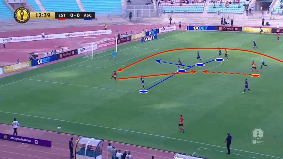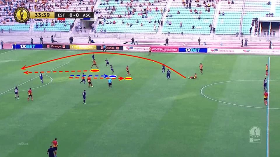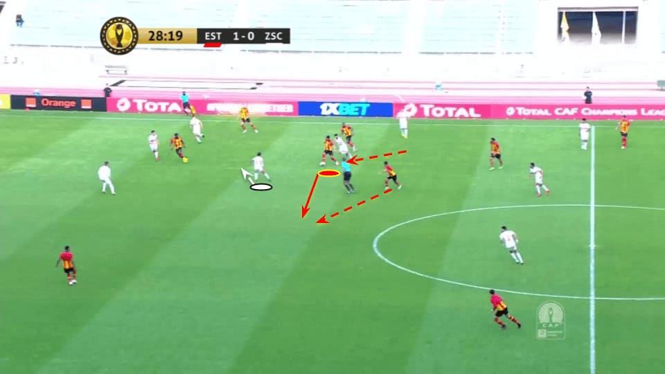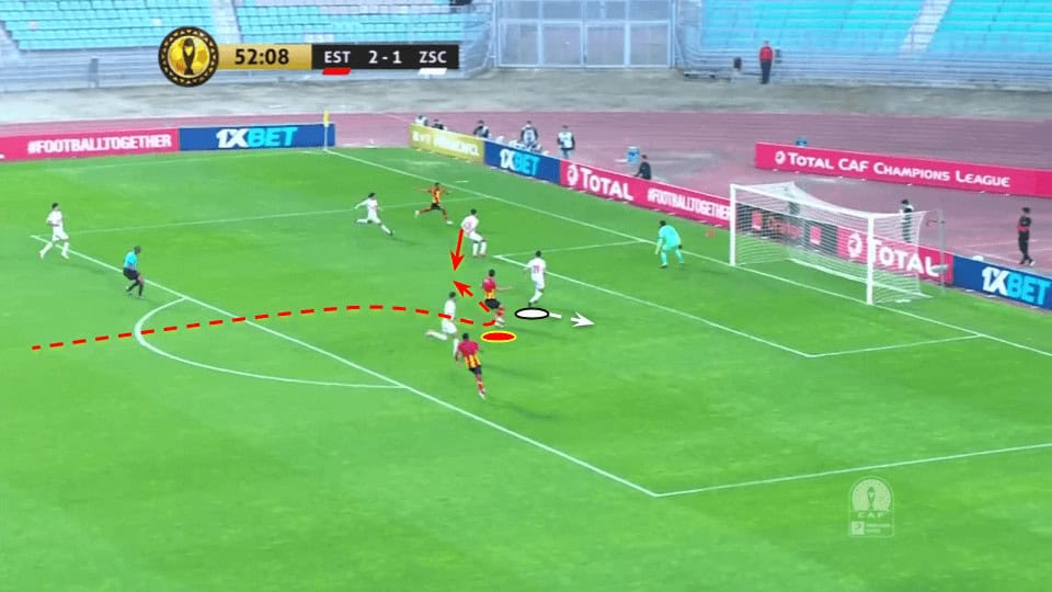 An example of the latest can be seen below. ES Tunis striker comes deep to offer a progressive passing option with his marker following him. This creates a space behind the rival centre-back and Ben Romdhage quickly runs into it, receiving the pass over the defensive line and creating an excellent chance.