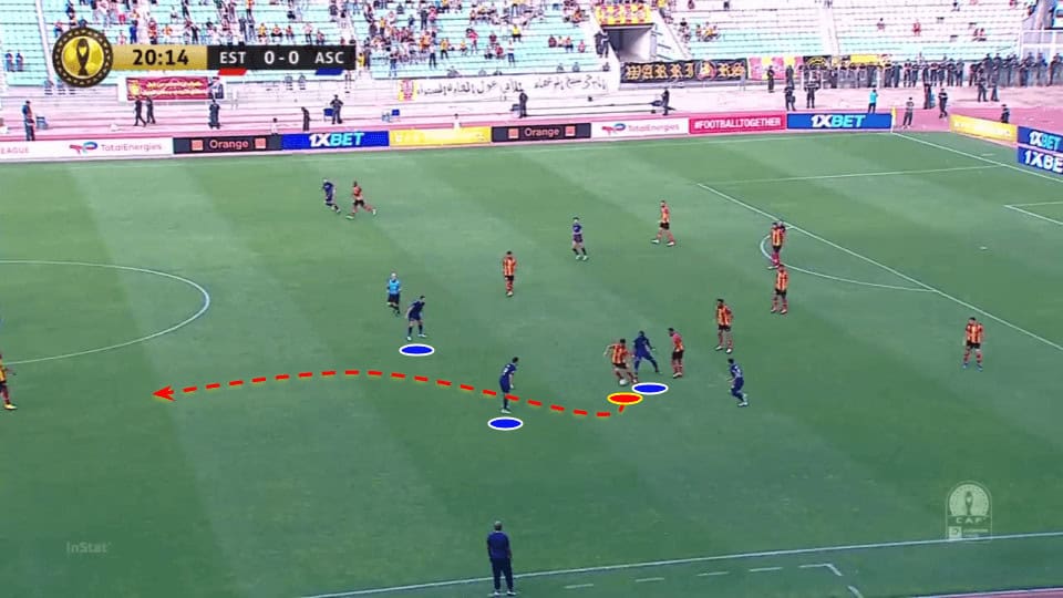 The sequence below illustrates this positioning behind the rival pressing line and how he then accelerates the attack. In the first picture, ES Tunis are being pressed in their box and Ben Romdhane gets himself into the free space behind the pressing rivals, creating a passing lane. In the second one, we see him after receiving, turning and running forward with the ball. In the exact moment shown, he’s shielding the ball from the rival before passing the ball into the run of the winger, setting up a good attacking play.