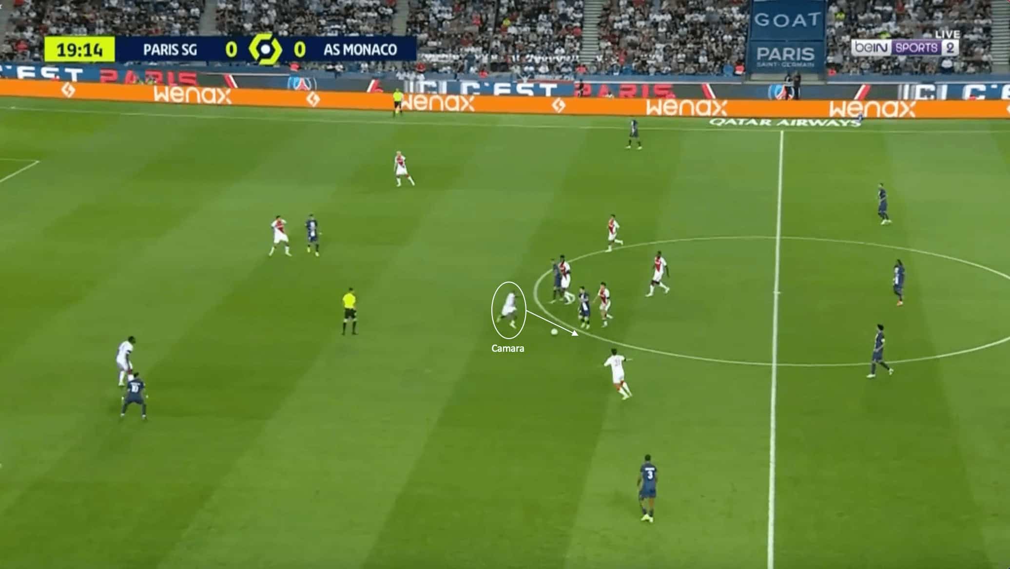 In this phase of play, Camara is in possession in a deeper midfield position and looks to find an open target in the box.