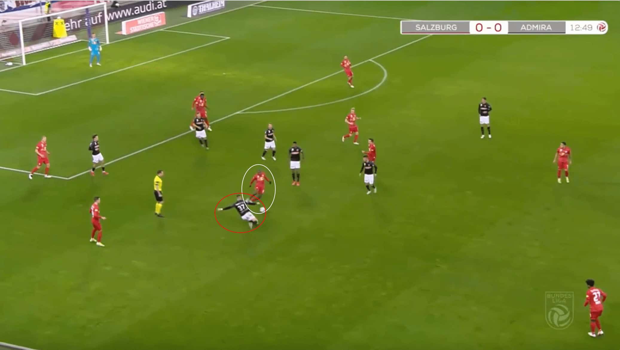In this phase of play above, the Malian has found himself in a wider position, giving him less time to get back into position in the case that Salzburg dispossesses and counterattacks.