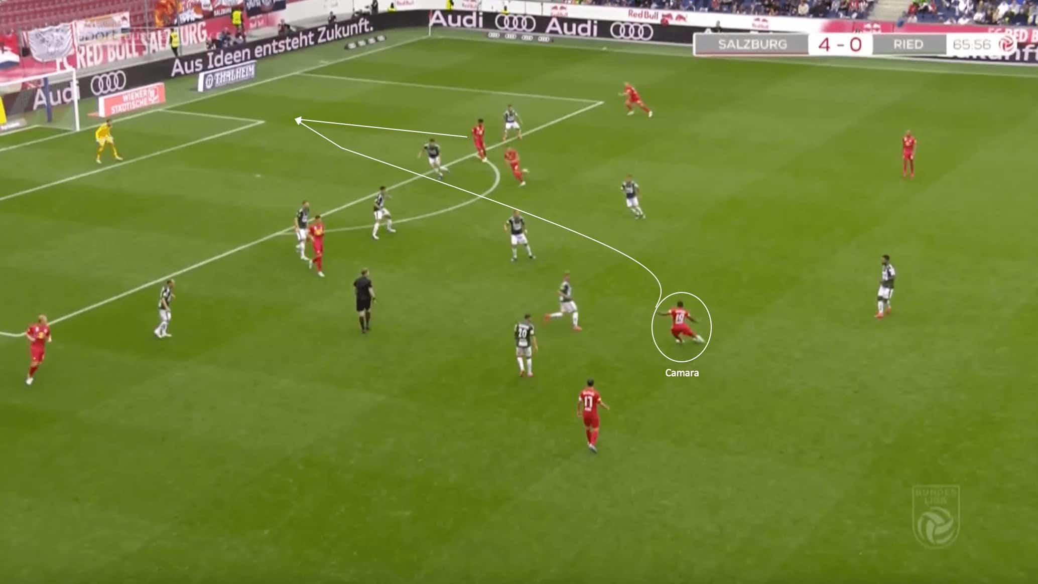 Camara does not contribute many assists to his side, but his ability to spray passes from these deep lying midfield positions helped RB Salzburg get past low blocks and in behind their defence with relative ease at times.