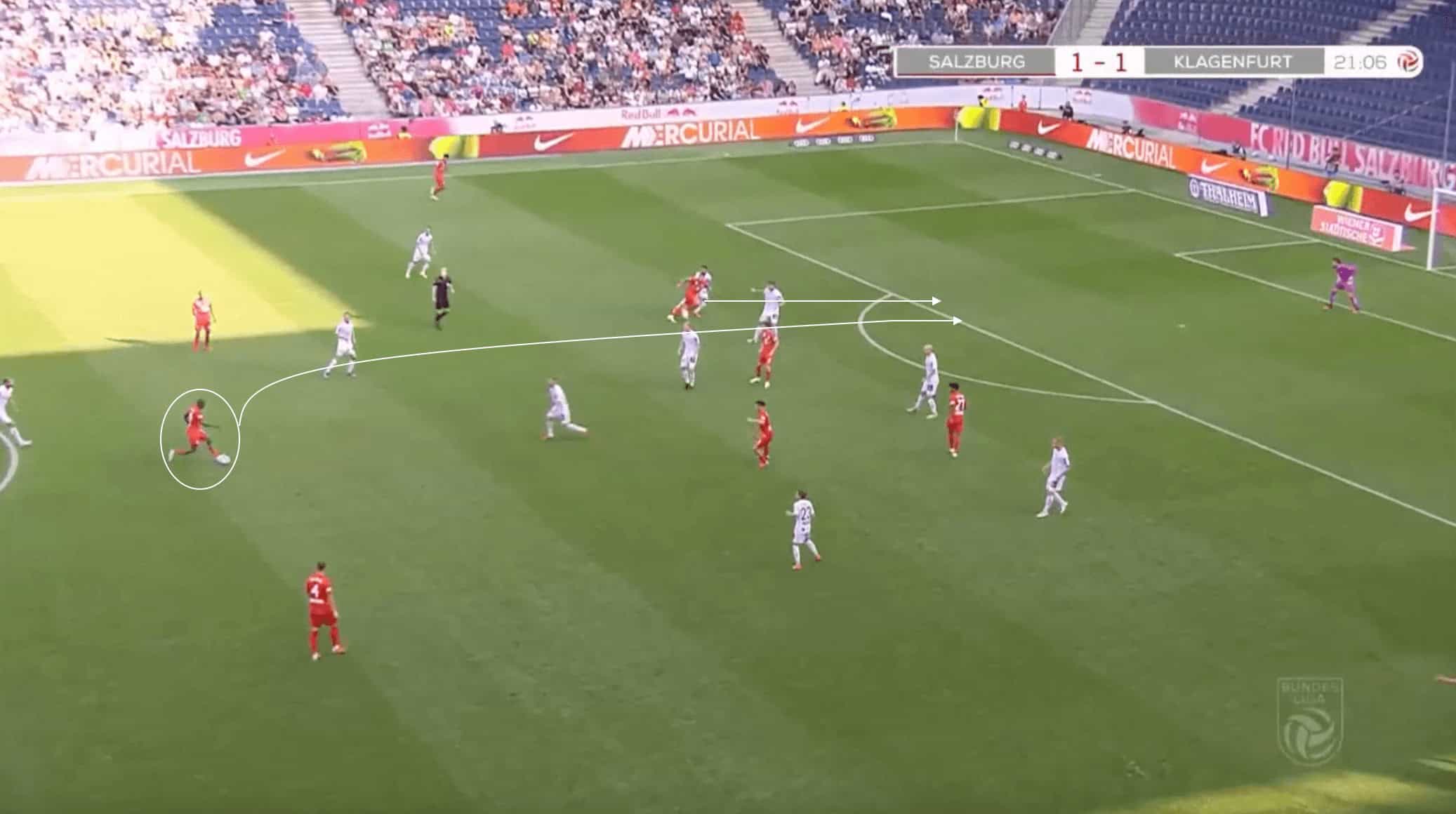 In the phase of play above, the Malian international midfielder spots the run of the RB Salzburg attacker running down the left touchline.