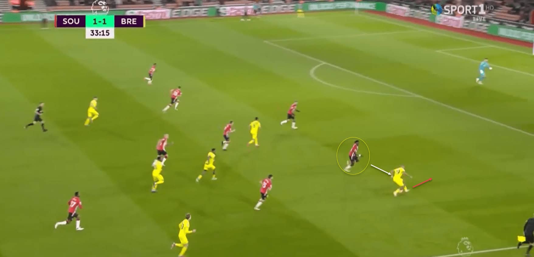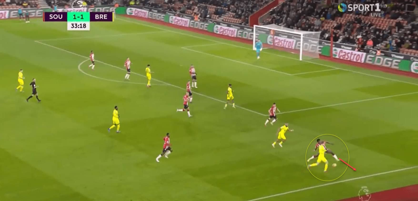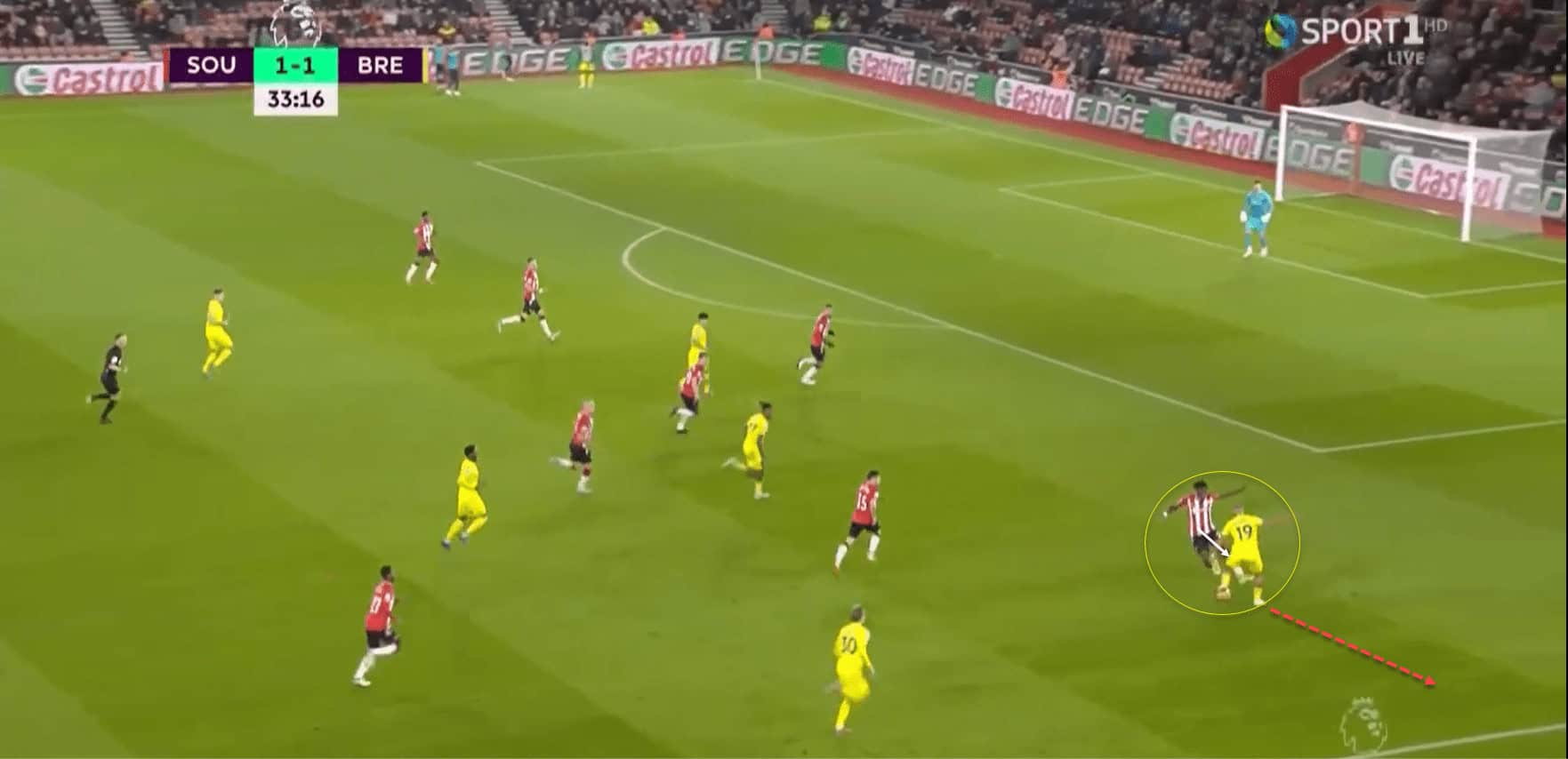 Salisu is a defender who thrives off defending his box and 6-yard area, making last-ditch tackles or blocks. This suits Southampton as they often face teams who dominate possession. The Majority of Salisu’s best defensive actions are in those instances when he’s defending his own 6-yard box. In addition, his strongest attributes are his physical ones, with him being very quick and strong which can make him very hard to beat 1 v 1. This example is from their game against Brentford and shows Salisu’s strong 1 v 1 defending. Brentford has just won the ball and has released  Mbuemo down the left side. Mbuemo has space and an advantage on Salisu but his speed allows him to get back and close the space off.