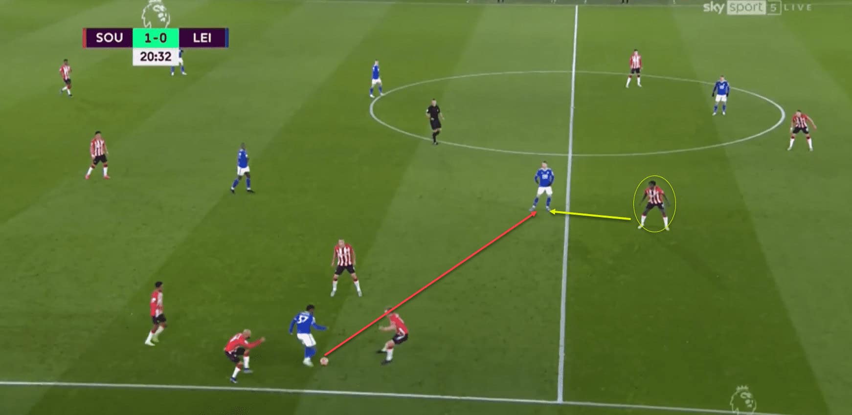 Salisu manages to get a small touch on the ball but is now out of the game on the floor, Leicester gathers the ball and exploits the massive whole in the Southampton defence left by Salisu.