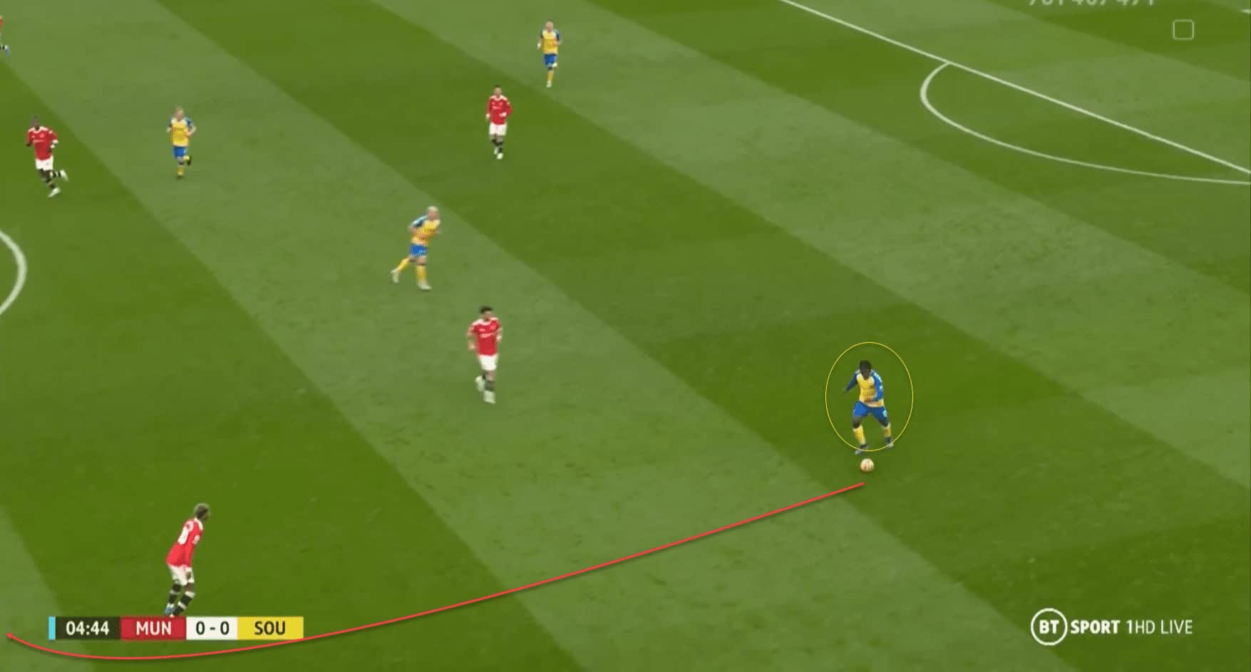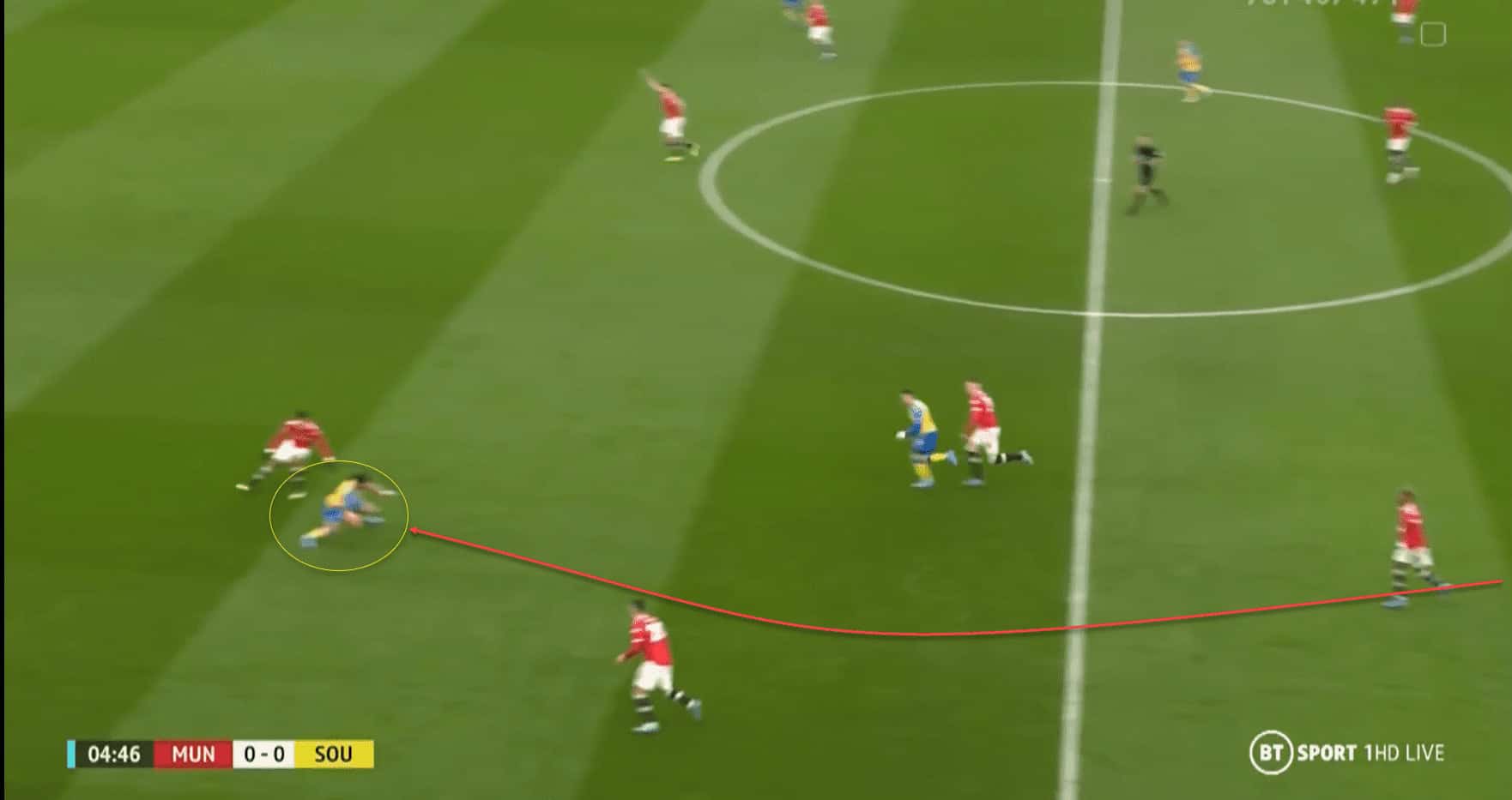 The first example came at Old Trafford in a recent fixture against Manchester United. Salisu has picked up the ball of his goalkeeper carried it forward, due to Manchester United sitting in a tactical deep block. He then decided to play the ball forward into Southampton forward Che Adams.