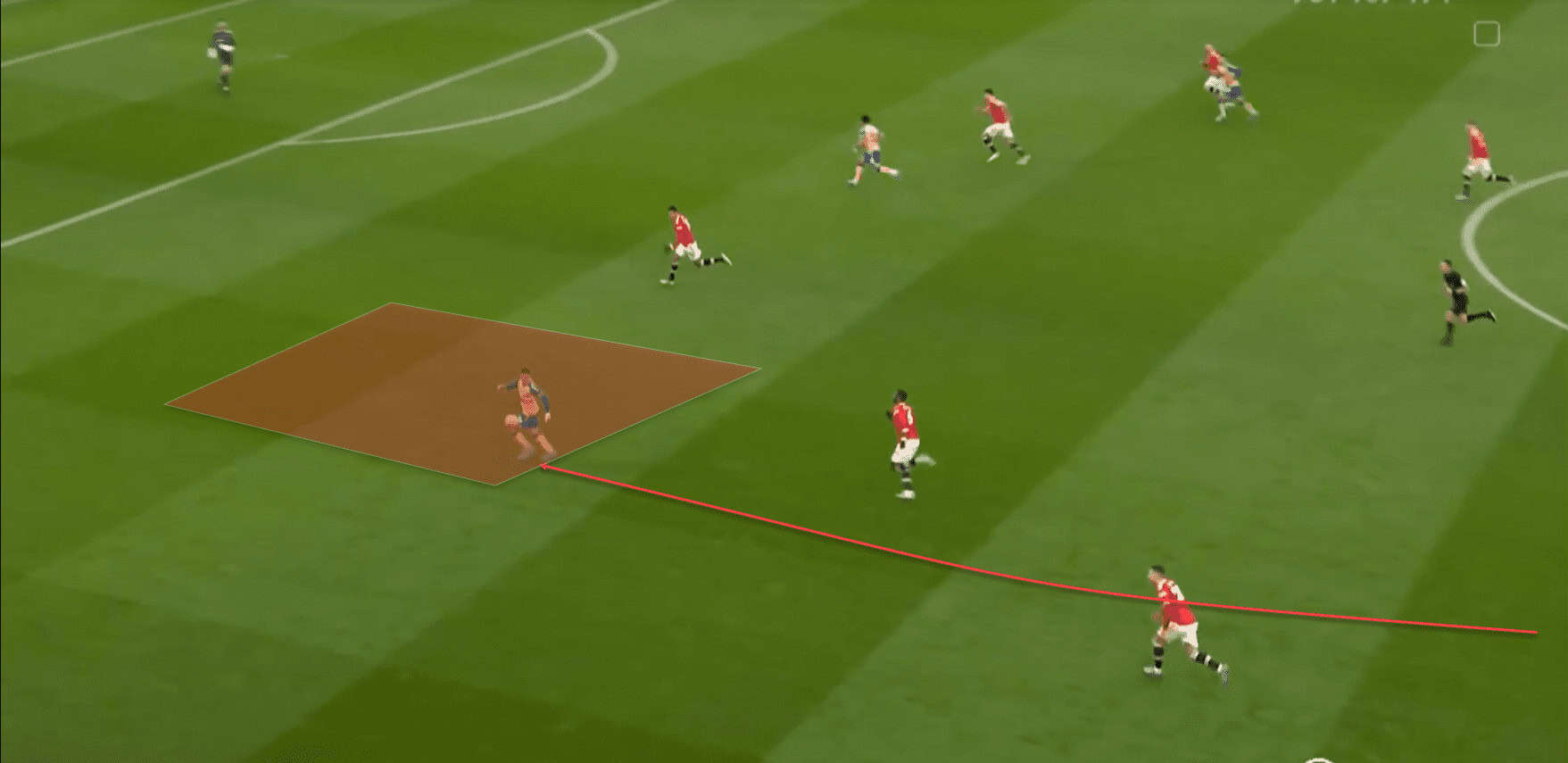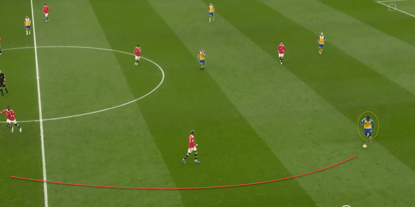 The next pass is in a similar situation in the same game, with Manchester United sitting so deep it provides a lot of opportunities for Salisu to progress the ball. in a similar manner, Salisu opens his body up and wants to play a pass beyond the midfield block into the opposition half.