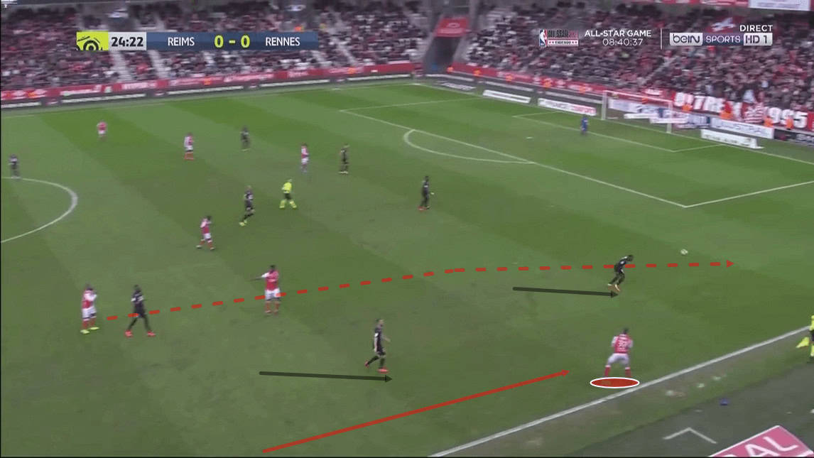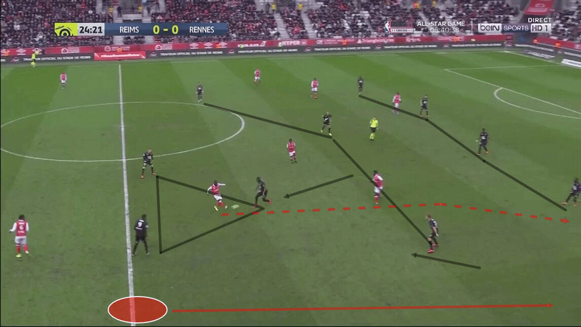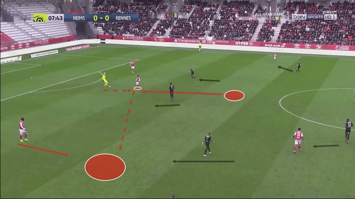 As Cassamá drops deep, he can collect the ball from the centre-backs, all the while creating a 3v2 advantage for them versus their opponent’s two centre-forwards. Cassamá receives possession of the ball well as he drops deep and manages to turn quickly and play the ball out to the right-back who is making a run down the wing. Cassamá’s pass finds the player and Reims can then begin to build into the middle third of the pitch.