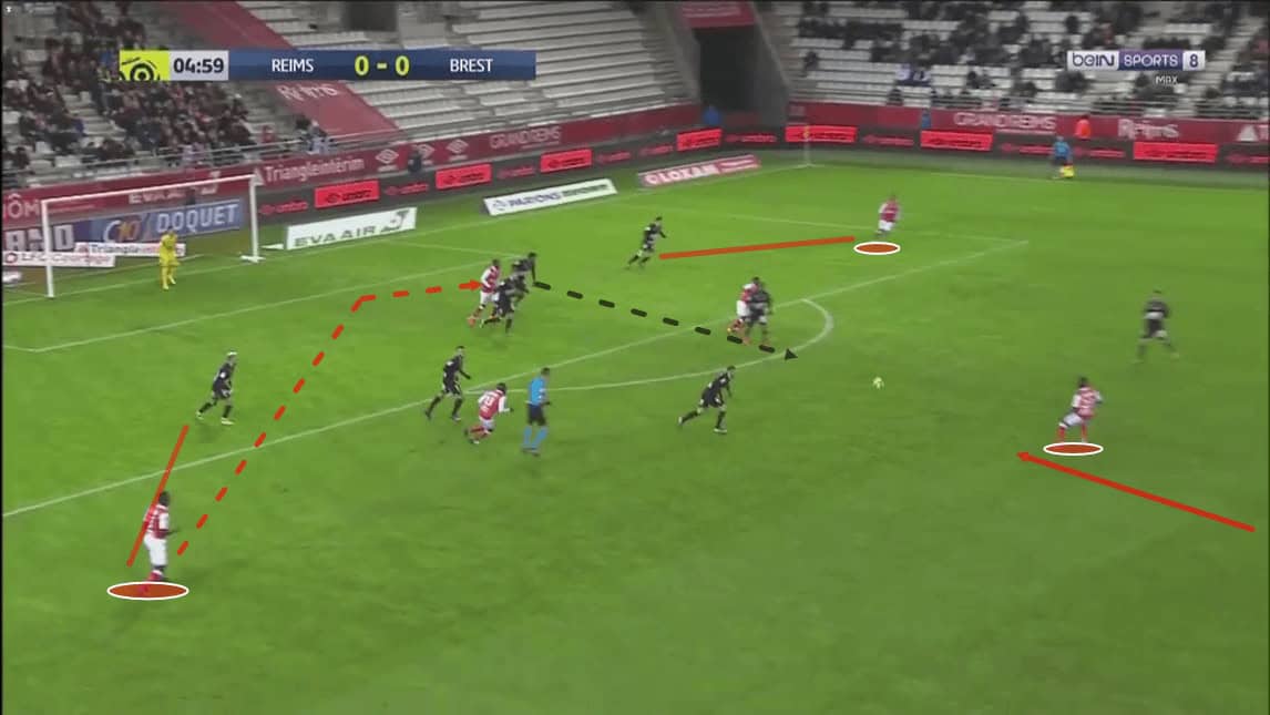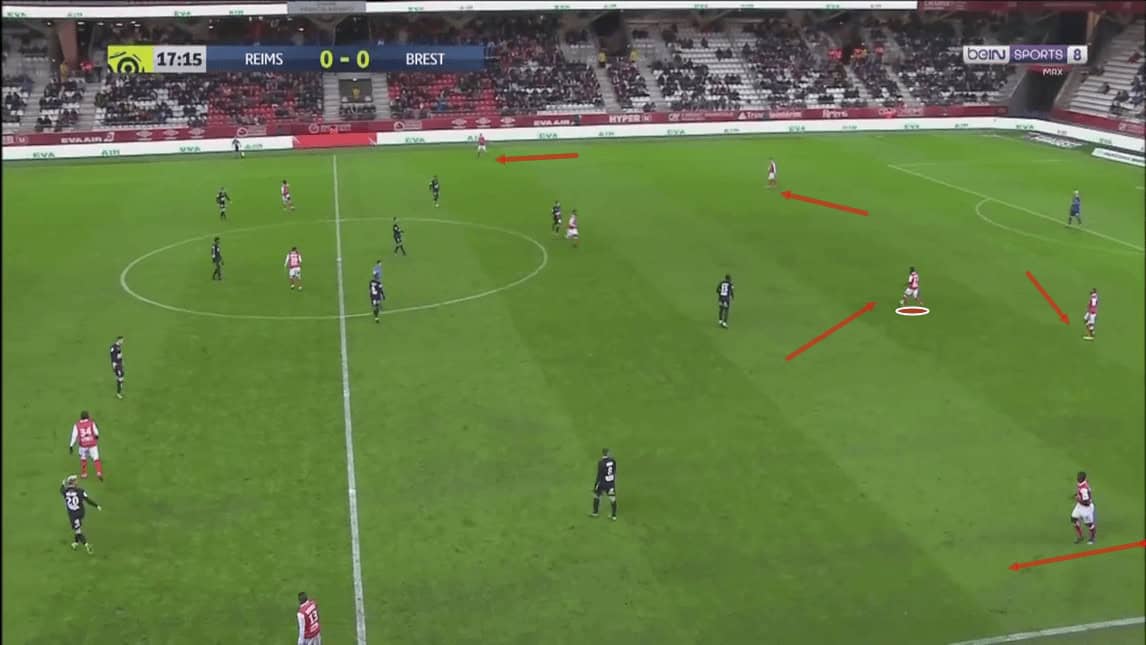 The next passage of play that we’re going to analyse is also taken from this clash between Reims and Brest. On this particular occasion, we can see that Cassamá is in possession of the ball in a slightly more advanced stage of play than he had been in previous examples.