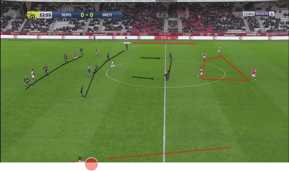 With this quartet of players holding their positions, this allows Reims’ two full-backs to advance into the opposition’s half of the pitch and this creates something resembling a 2-2-4-2 shape at this point.