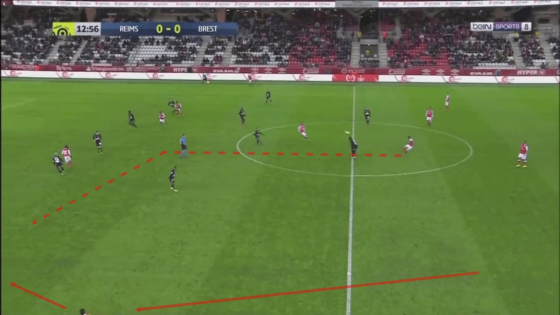 Here, we can see how Reims’ attacking shape develops within their base 4-2-3-1 shape as play advances into the final two-thirds of the pitch. Reims’ two centre-backs and their two holding midfielders, one of whom is Cassamá, maintain their position in a deep central zone as their side attempt to break into the oppositions half of the pitch.