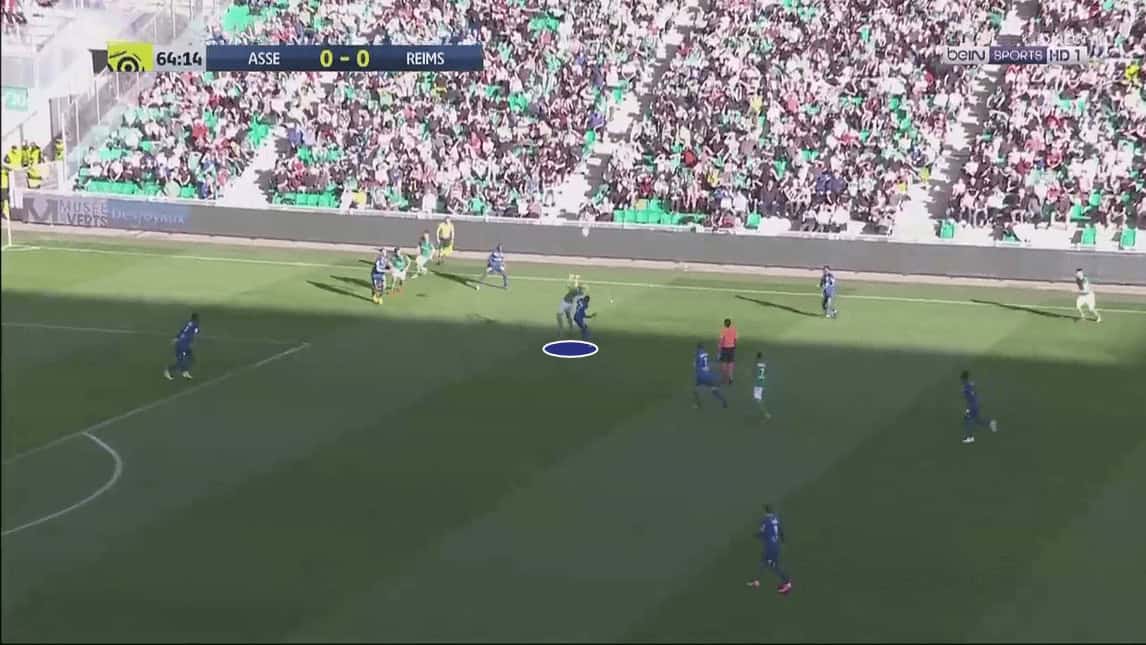 The Reims midfielder is an intense player who displays explosiveness and power in his game, however, he essentially gets dominated in the air by the Saint-Étienne player here. This is an area of Cassamá’s game which has already been targeted by some opposition goal-kicks and throw-ins and such and it may be one of the more glaring negatives to his game.