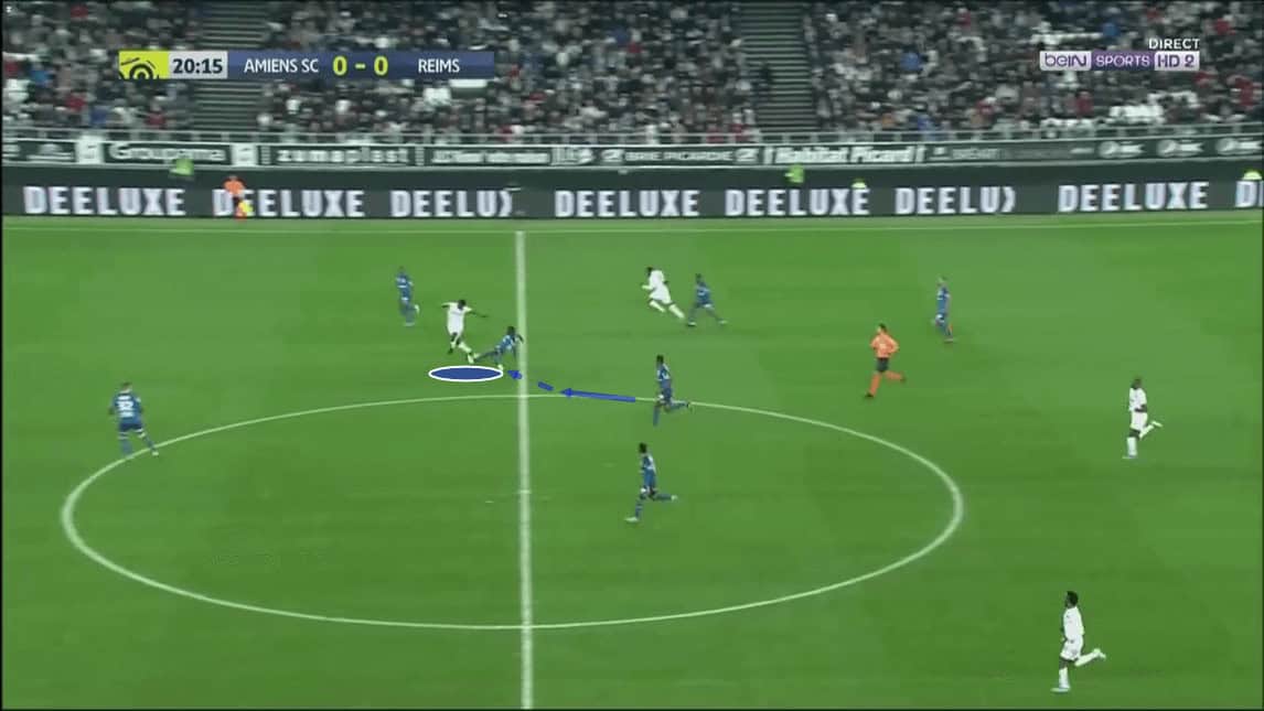 This passage of play provides us with a clear example of Cassamá’s positioning and role in his side’s build-up play. The Guinea-Bissau international is intelligent and proactive in his movement to help his side advance play. Furthermore, this diagonal pass from the centre out to the wide areas is a pass that Cassamá frequently makes as Reims often build-up their attacks through him out into the wider areas as play advances from the first third of the pitch.
