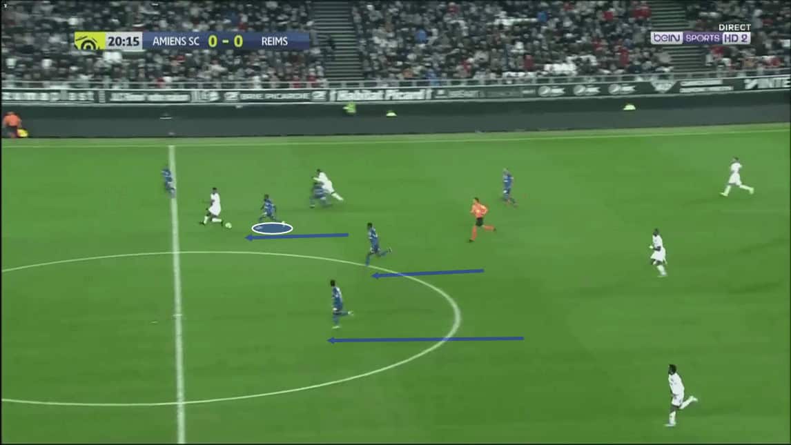 This next image is taken from Reims’ clash with Amiens back in January. Here, we can see Amiens, wearing the white strip, in possession of the ball attempting to hurt Reims on the counterattack. They had just played a through ball to the player who we can see receiving possession here as they are breaking into Reims’ half of the pitch.