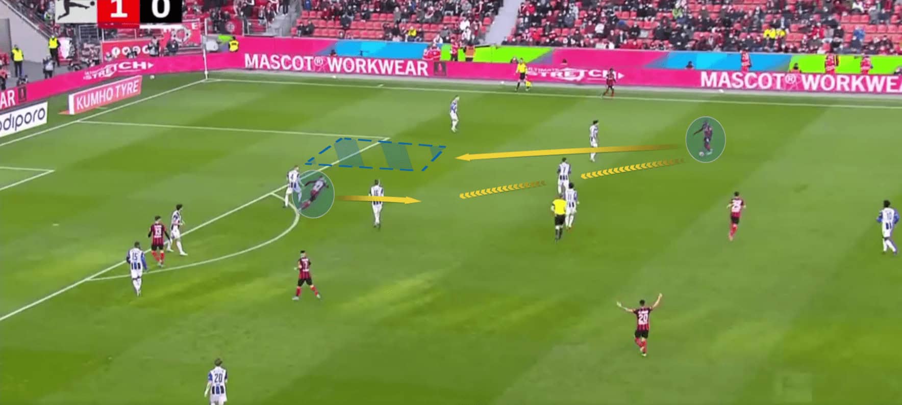 Here Moussa Diaby is positioned in the half-space on the right-hand side, in this scenario he drops to receive the ball. This is because the left full-back of Arminia Bielefeld is sitting narrow. The full-back can’t follow him due to the possibility of a forward run down the right flank from Jeremie Frimpong.