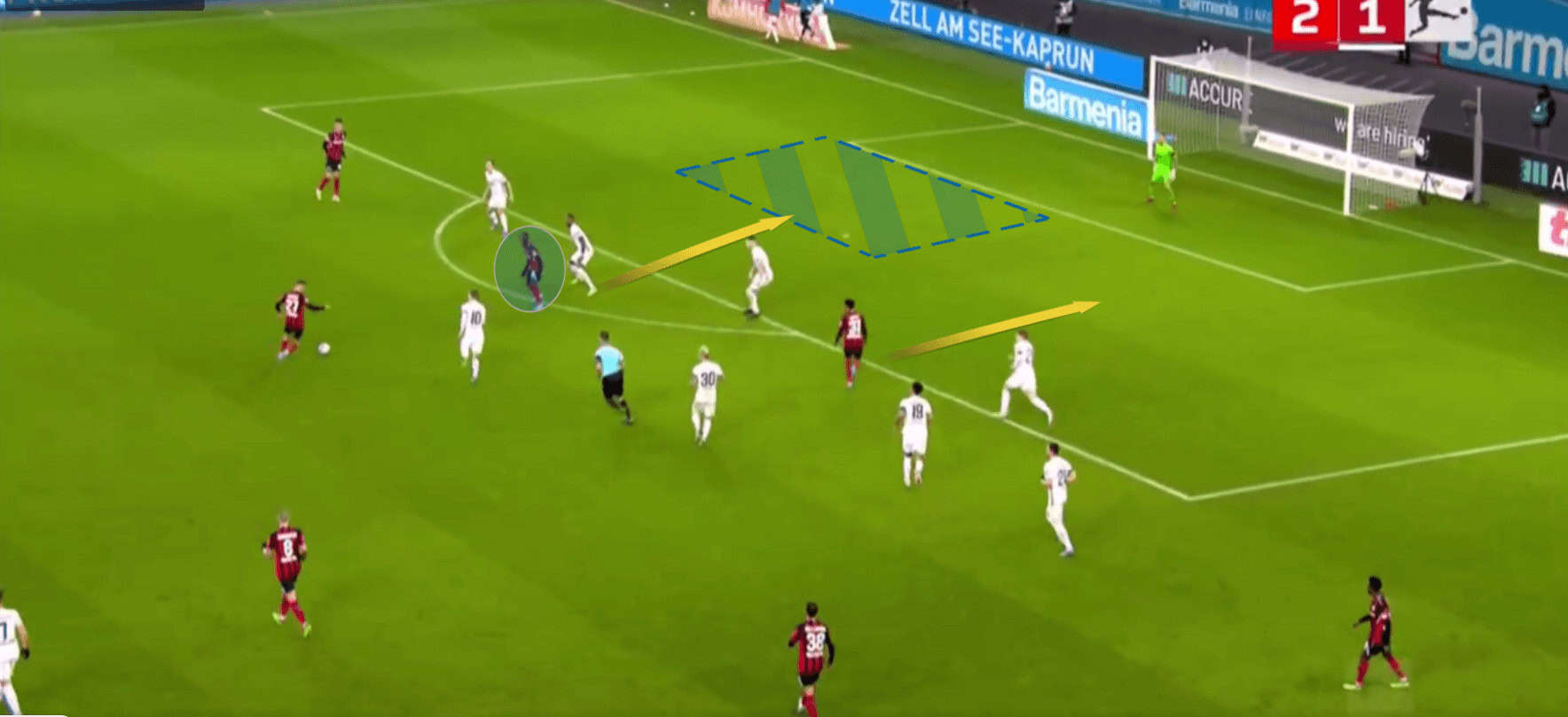 As the arrows show, he plays a one-two with Florian Wirtz and drives forward through the half-space and scores to put Bayer Leverkusen two-nil up in this match.