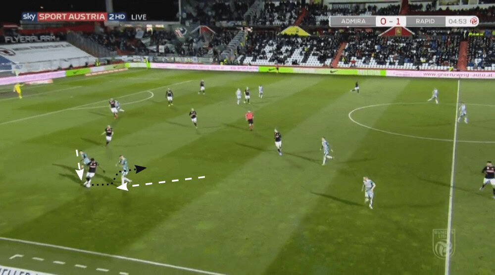 Defensively, Saracevic is very disciplined and tries to help his wide defender out of possession. Admira mainly used a 4-2-3-1 or 4-1-4-1 in the recent season and they were among the most defensive-orientated teams. They had on average of only 44.7% possession and allowed 10.8 passes before they made a defensive action (also known as PPDA). For both metrics, they are among the three teams in the Austrian Bundesliga with the “weakest” values.